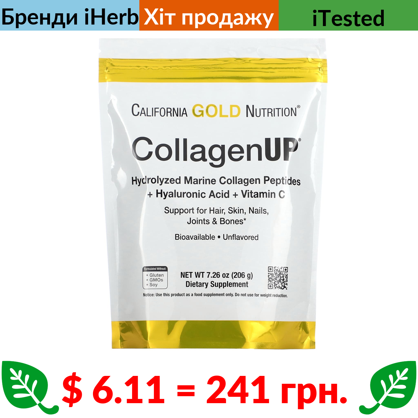 $ 6.11 = 241 грн. California Gold Nutrition, CollagenUP, пептиди гідролізованого морського колагену з гіалуроновою кислотою та вітаміном C, без добавок, 206 г (7,26 фунта)