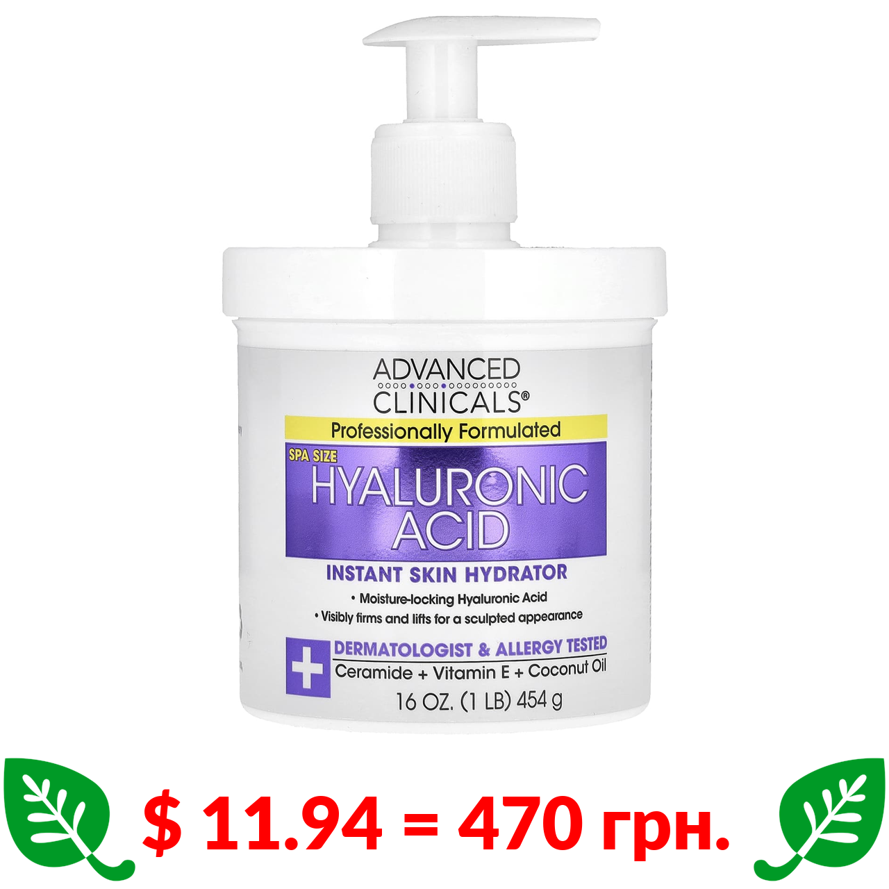 $ 11.94 = 470 грн. Advanced Clinicals, гіалуронова кислота, миттєве зволоження шкіри, 454 г (1 фунт / 16 унцій)