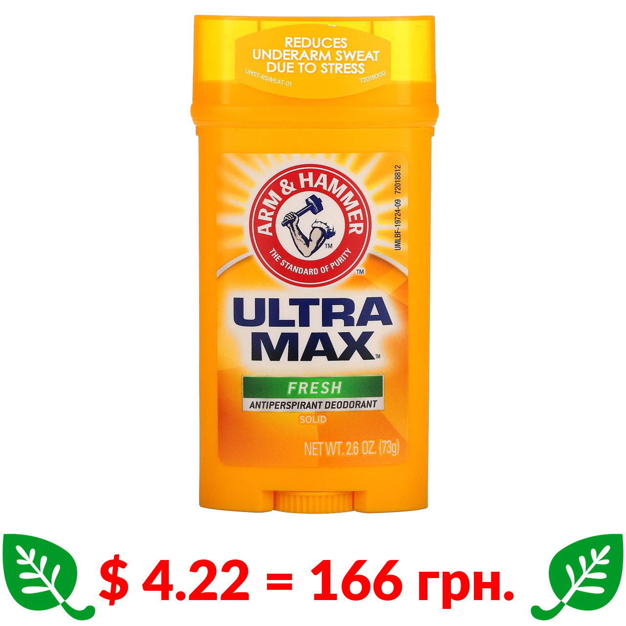 $ 4.22 = 166 грн. Arm & Hammer, UltraMax, твердий дезодорант-антиперспірант для чоловіків, зі свіжим ароматом, 73 г (2,6 унції)
