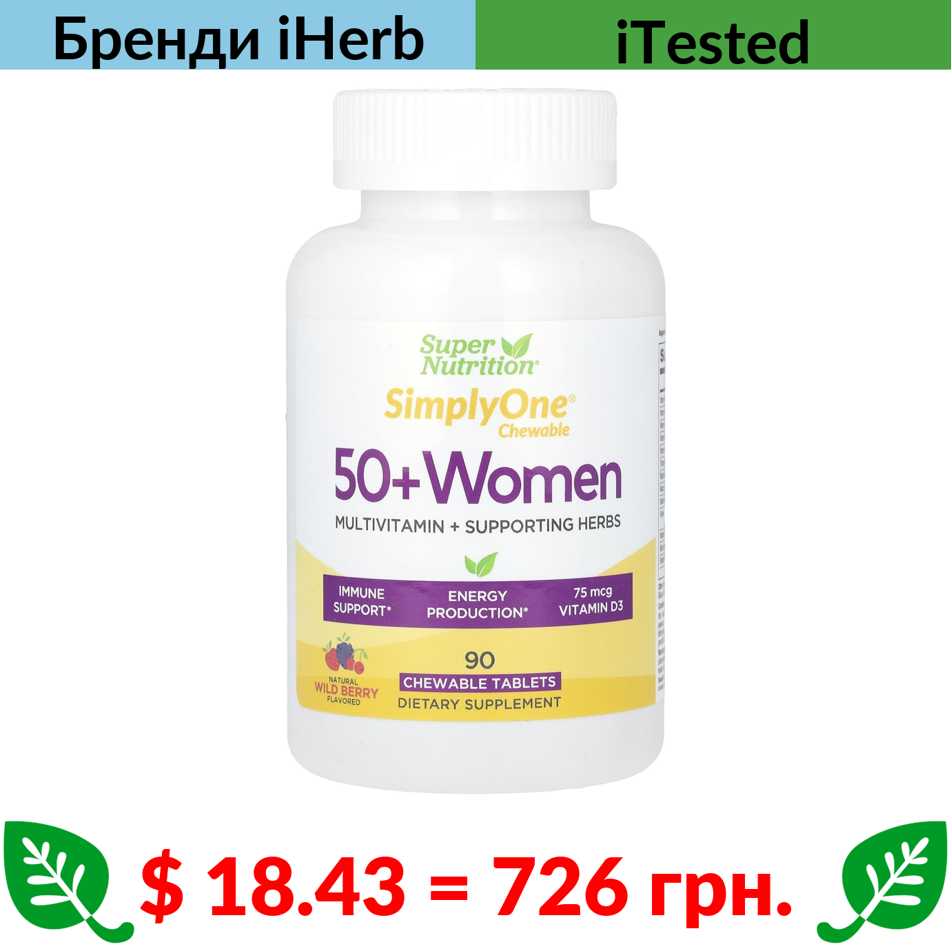 $ 18.43 = 726 грн. Super Nutrition, SimplyOne, мультивітаміни й корисні трави для жінок від 50 років, зі смаком лісових ягід, 90 жувальних таблеток