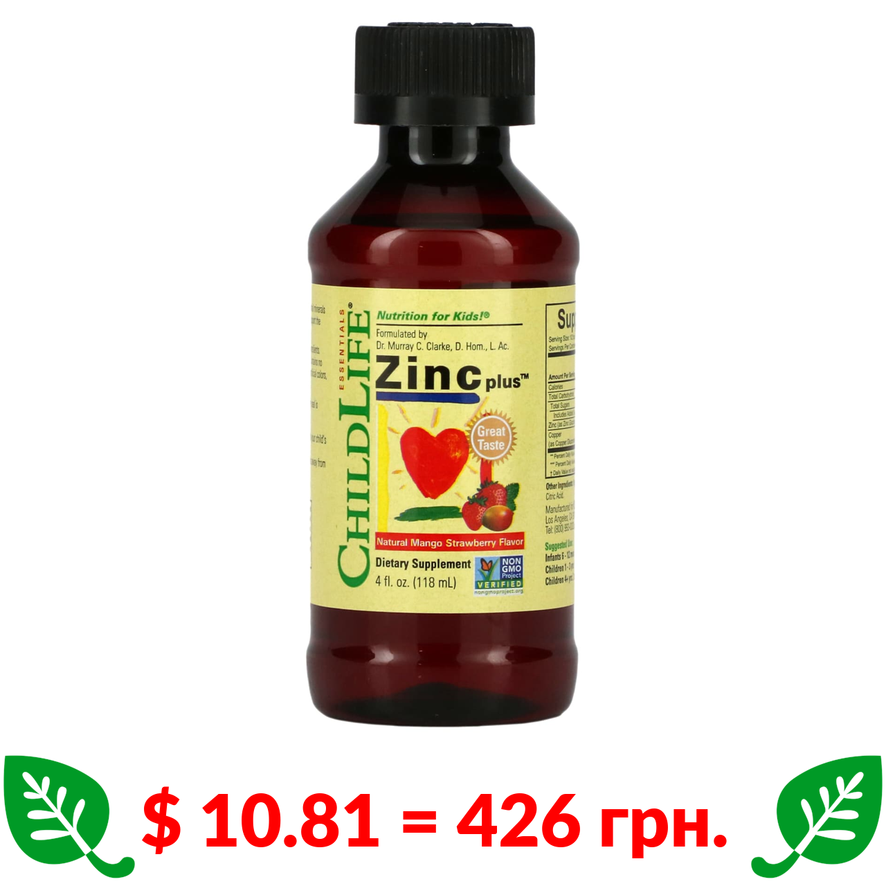 $ 10.81 = 426 грн. ChildLife Essentials, Essentials, Zinc Plus, добавка з цинком, зі смаком натурального манго та полуниці, 118 мл (4 рідк. унції)