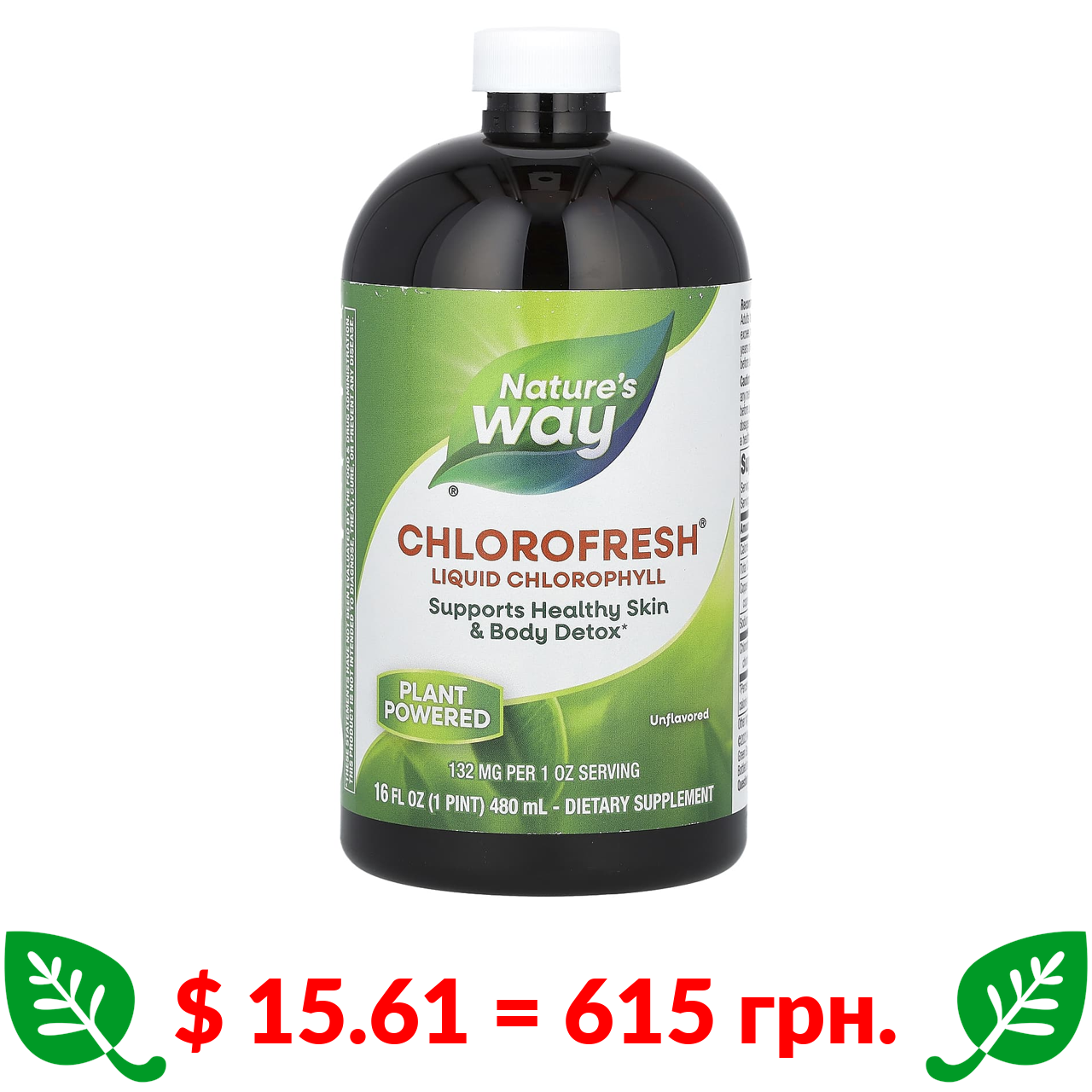 $ 15.61 = 615 грн. Nature’s Way, Chlorofresh, рідкий хлорофіл, з нейтральним смаком, 480 мл (16 рідк. унцій)