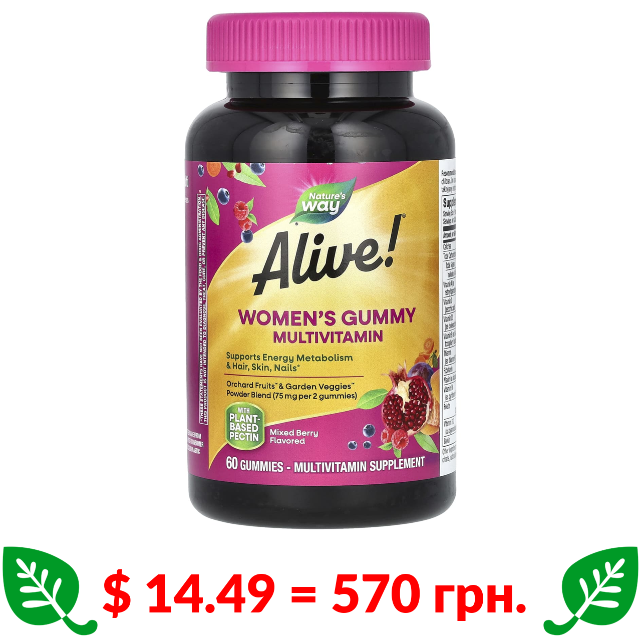 $ 14.49 = 570 грн. Nature’s Way, Alive!, комплекс мультивітамінів для жінок, суміш ягід, 60 жувальних мармеладок