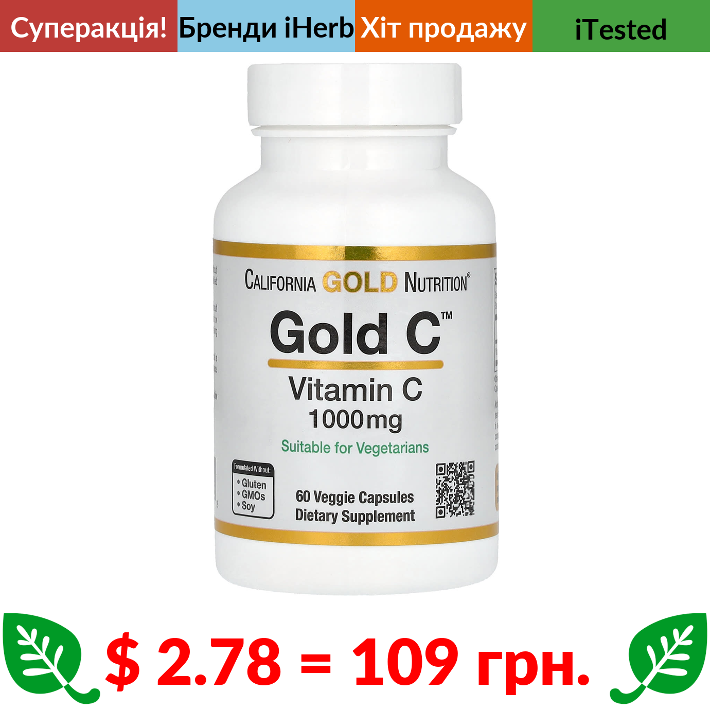 $ 2.78 = 109 грн. ???? cуперакція! ???? California Gold Nutrition, Gold C, вітамін С, 1000 мг, 60 вегетаріанських капсул