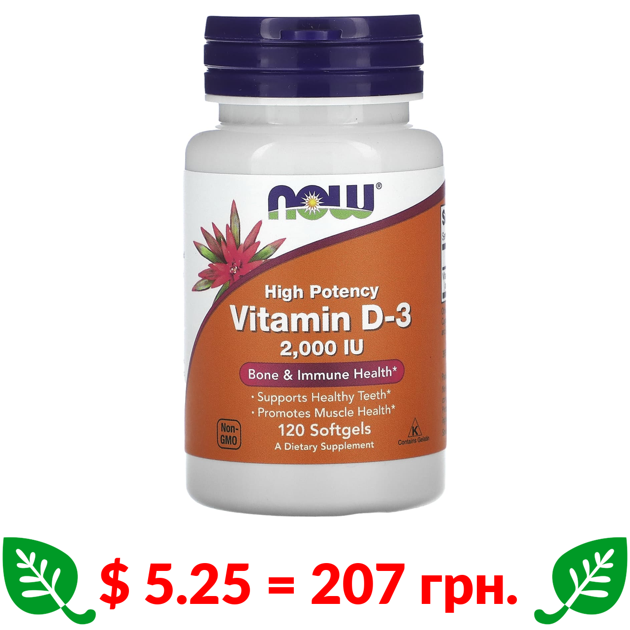 $ 5.25 = 207 грн. Now Foods, високоефективний вітамін D3, 50 мкг (2000 МО), 120 капсул