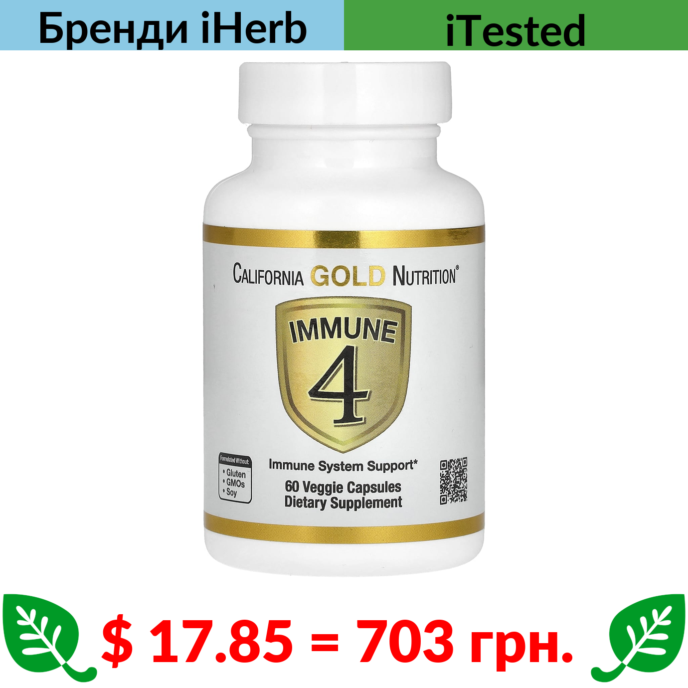 $ 17.85 = 703 грн. California Gold Nutrition, Immune 4, засіб для зміцнення імунітету, 60 вегетаріанських капсул