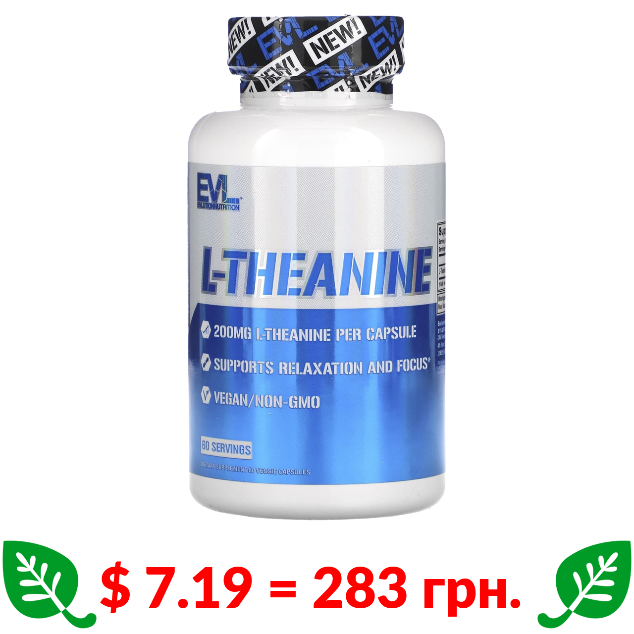 $ 7.19 = 283 грн. ????️ у кошику ????️ EVLution Nutrition, L-теанін, 200 мг, 60 вегетаріанських капсул