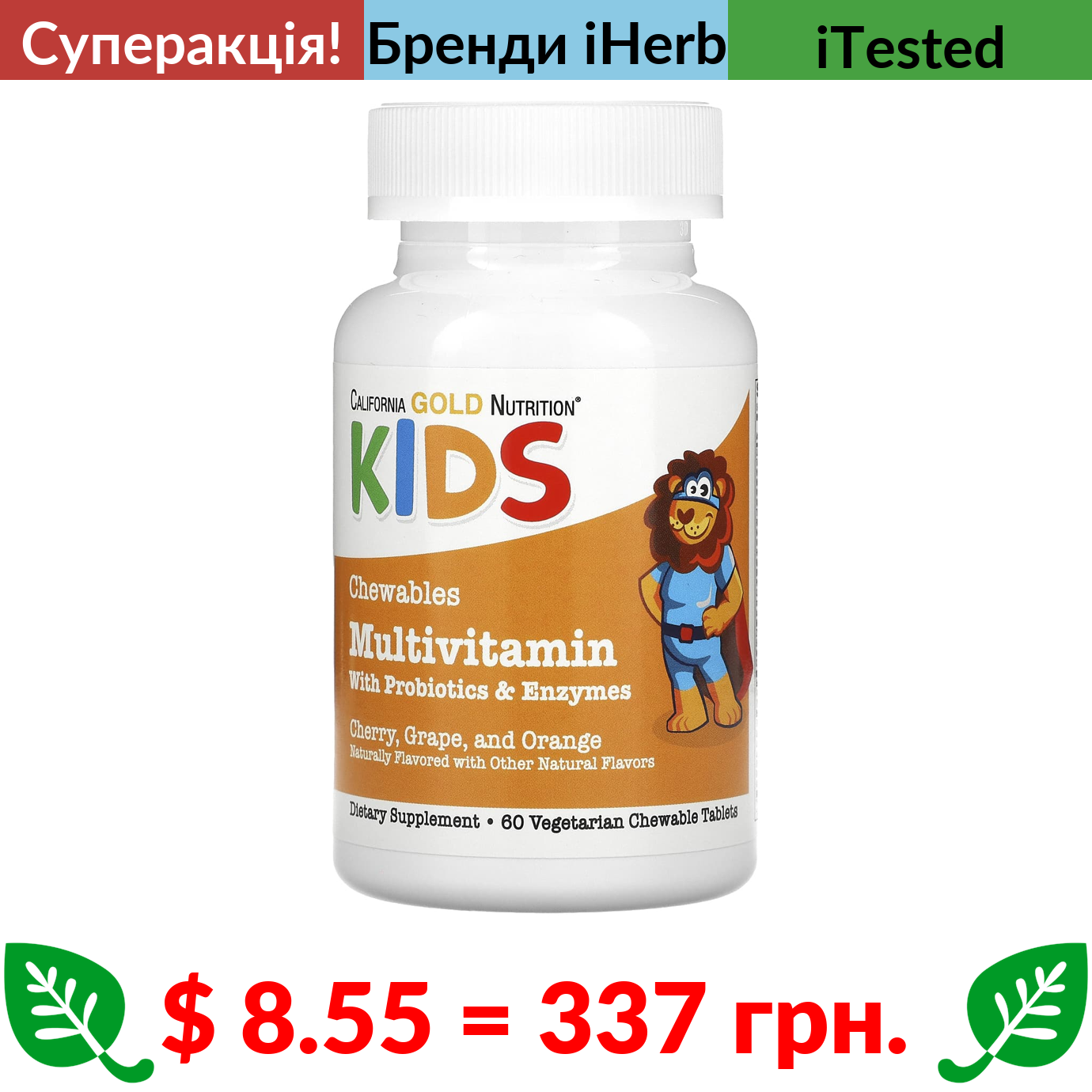 $ 8.55 = 337 грн. ???? cуперакція! ???? California Gold Nutrition, жувальні мультивітаміни з пробіотиками та ферментами для дітей, зі смаком фруктів, 60 вегетаріанських таблеток