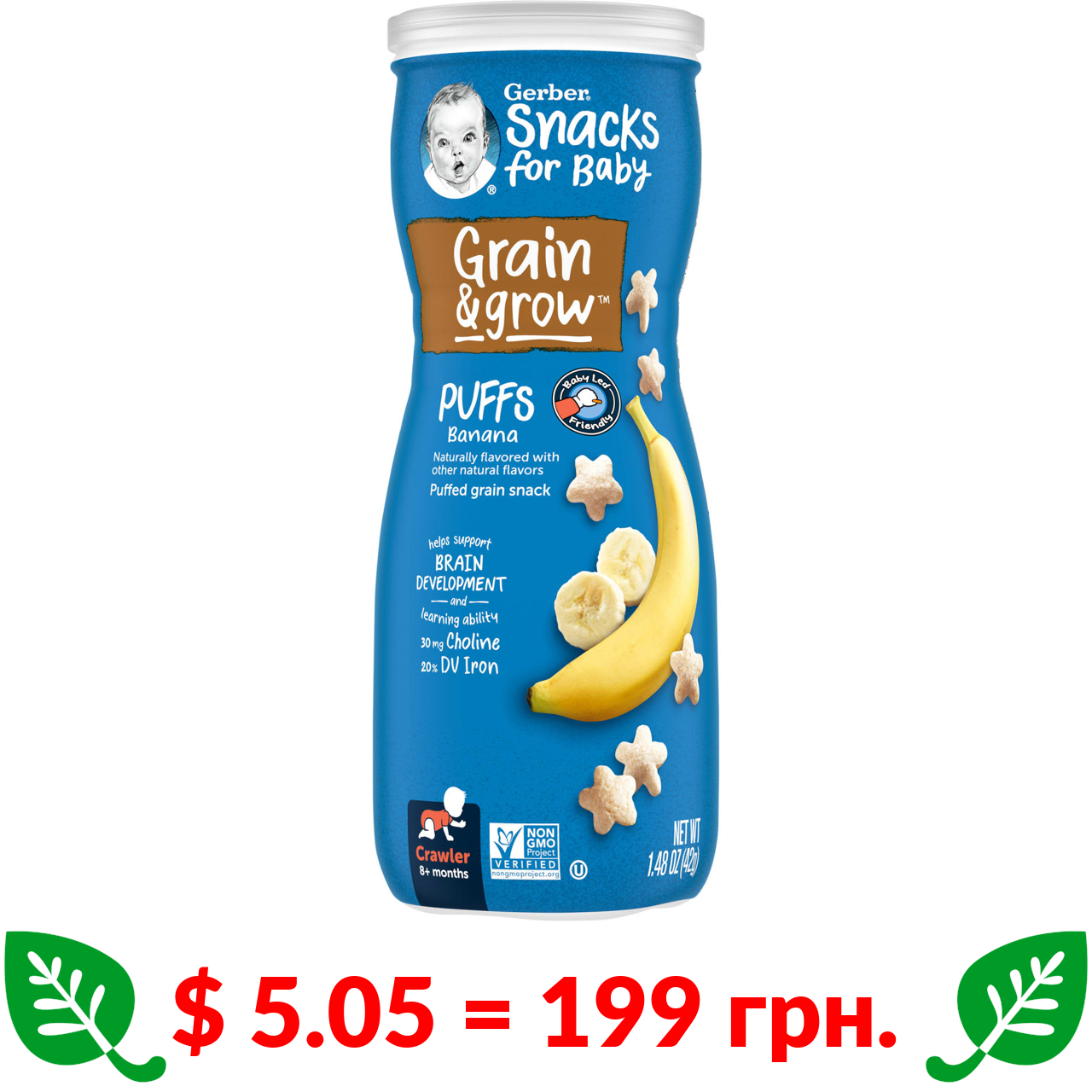 $ 5.05 = 199 грн. Gerber, Puffs, зернові снеки, для дітей у віці від 8 місяців, банан, 42 г (1,48 унції)