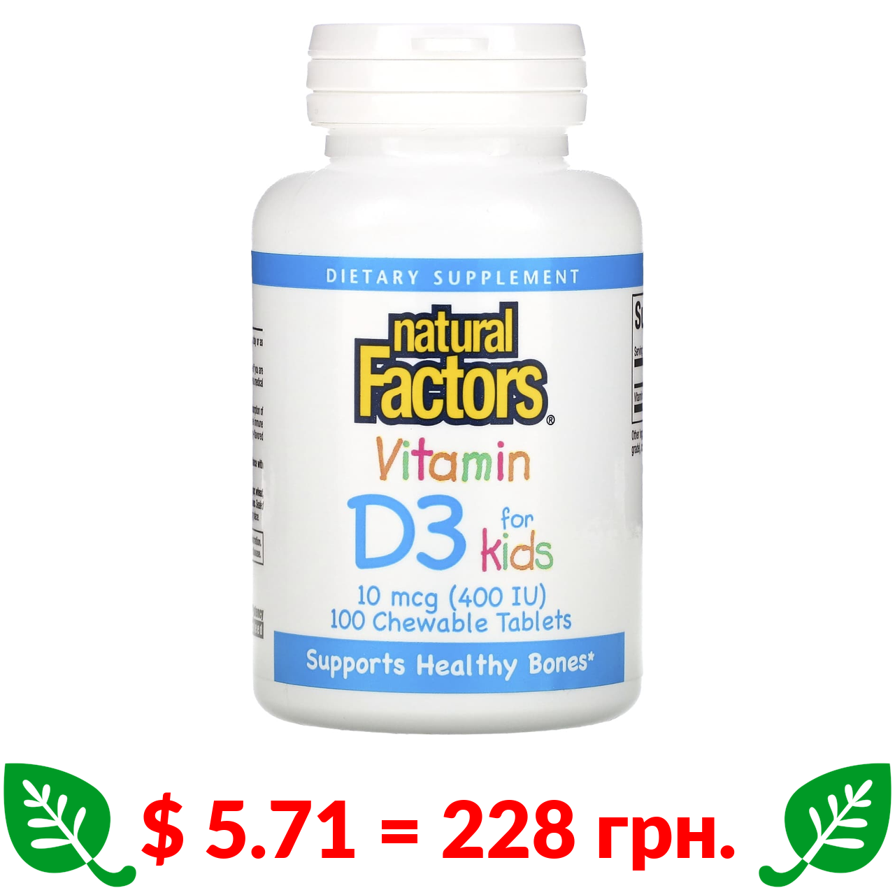 $ 5.71 = 228 грн. Natural Factors, вітамін D3, зі смаком полуниці, 10 мкг (400 МО), 100 жувальних таблеток