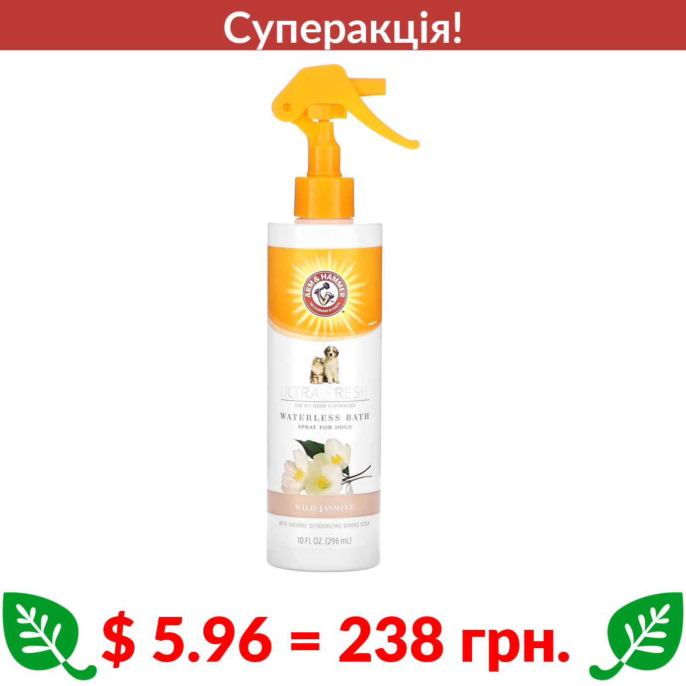 $ 5.96 = 238 грн. ???? cуперакція! ???? Arm & Hammer, Ultra Fresh, Waterless Bath, Spray for Dogs, Wild Jasmine, 10 fl oz (296 ml)