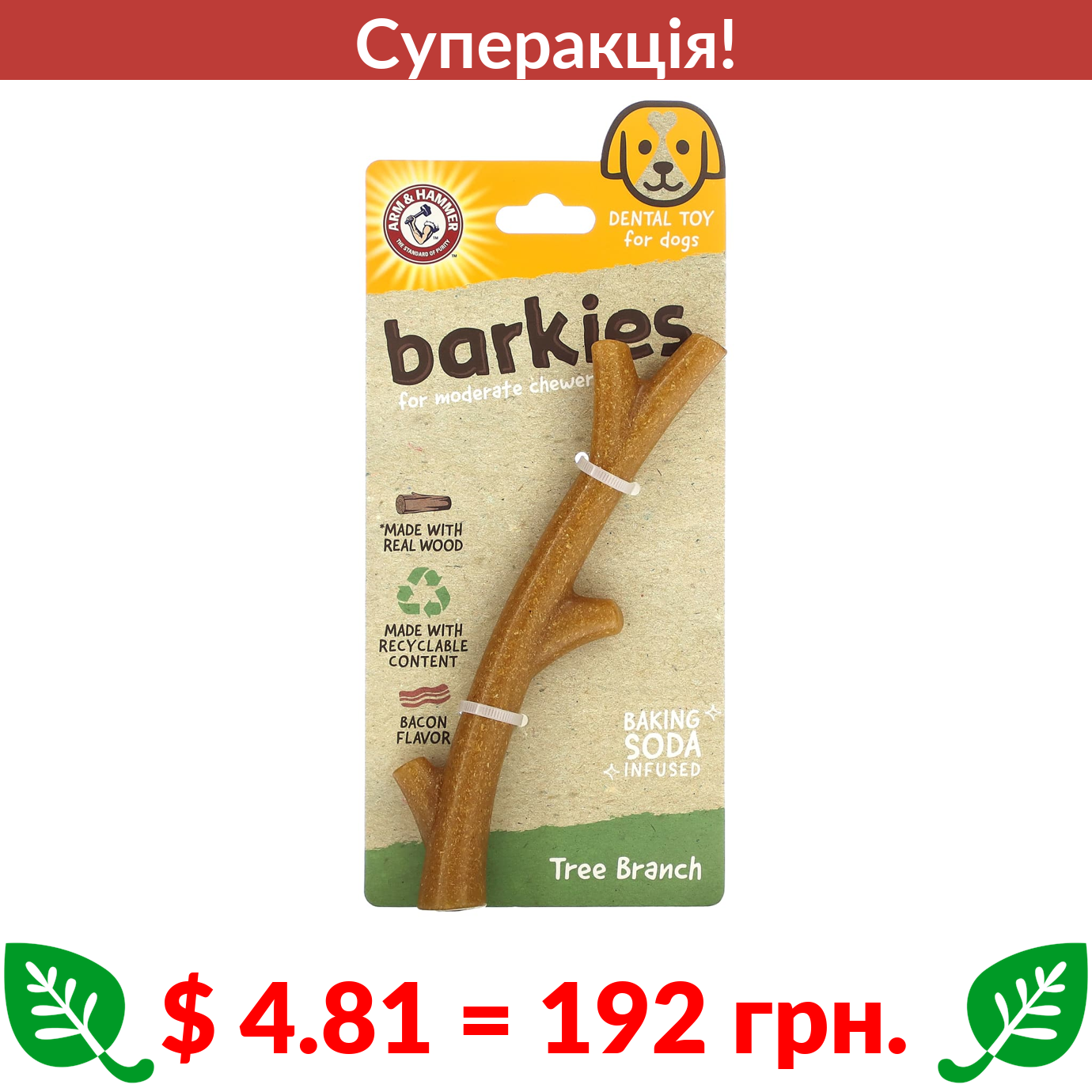 $ 4.81 = 192 грн. ???? cуперакція! ???? Arm & Hammer, Barkies for Moderate Chewers, Dental Toy for Dogs, Tree Branch, Bacon, 1 Toy
