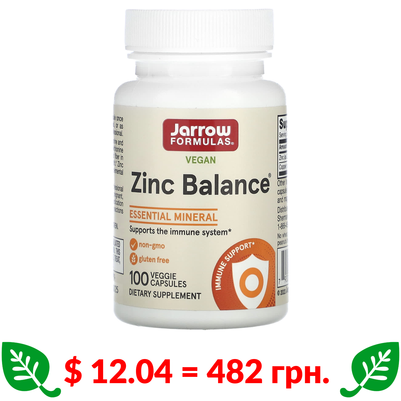 $ 12.04 = 482 грн. Jarrow Formulas, Zinc Balance, веганський цинк, 100 рослинних капсул