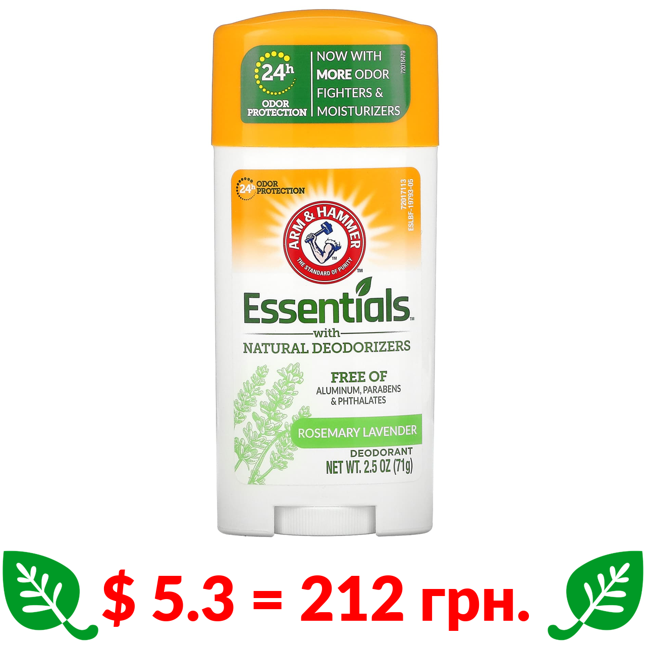 $ 5.3 = 212 грн. Arm & Hammer, Essentials, дезодорант із натуральними дезодорувальними речовинами, розмарин і лаванда, 71 г (2,5 унції)