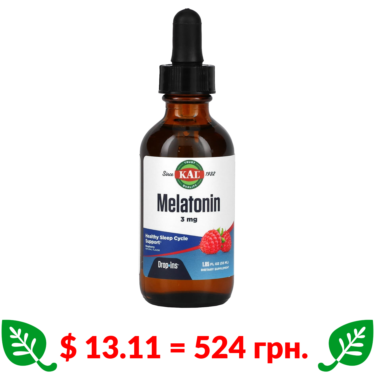 $ 13.11 = 524 грн. KAL, Melatonin, Natural Raspberry Flavor, 3 mg, 1.85 fl oz (55 ml)