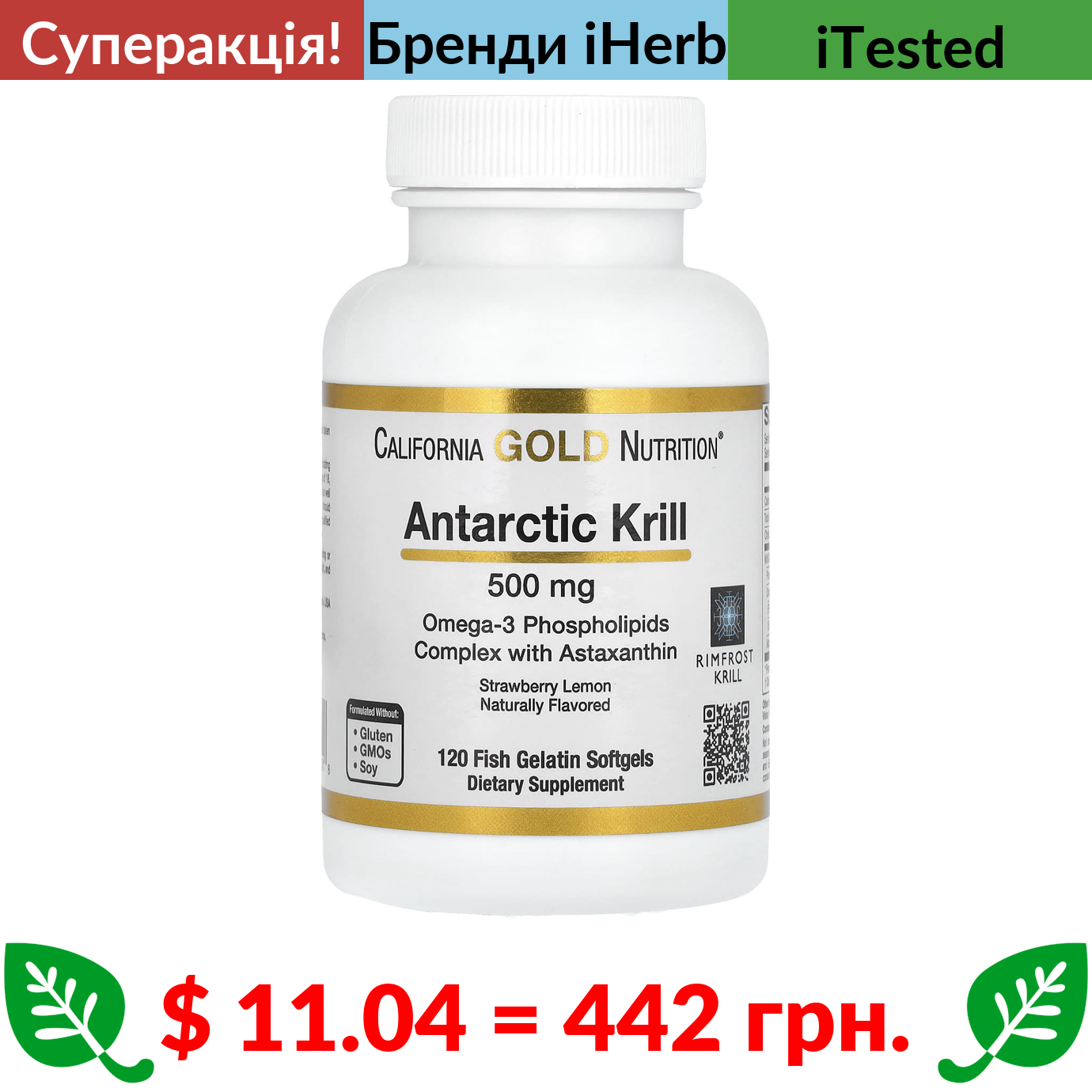 $ 11.04 = 442 грн. ???? cуперакція! ???? California Gold Nutrition, жир антарктичного криля, комплекс фосфоліпідів омега-3 з астаксантином, з натуральним смаком полуниці та лимона, 500 мг, 120 капсул із риб’ячого желатину