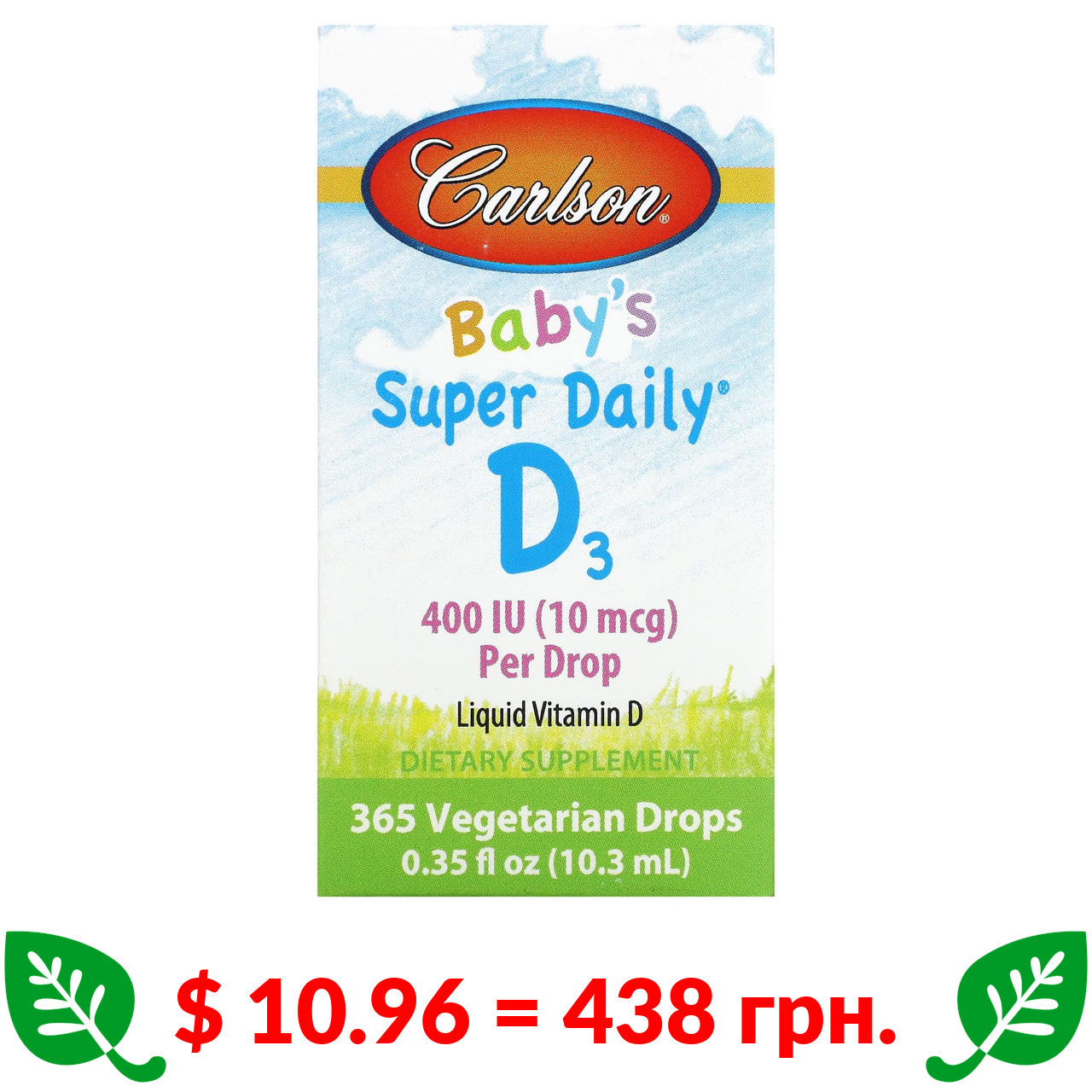 $ 10.96 = 438 грн. Carlson, Baby’s Super Daily, вітамін D3, 10 мкг (400 МО), 10,3 мл (0,35 рідк. уніції)