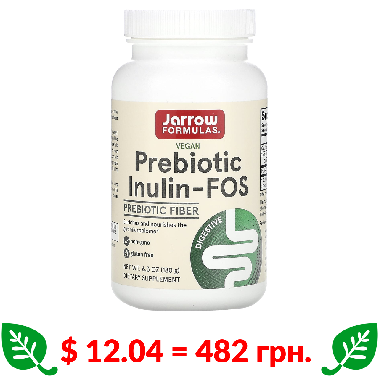 $ 12.04 = 482 грн. Jarrow Formulas, пребіотики з інуліном і фруктоолігосахаридами, порошок, 180 г (6,3 унції)