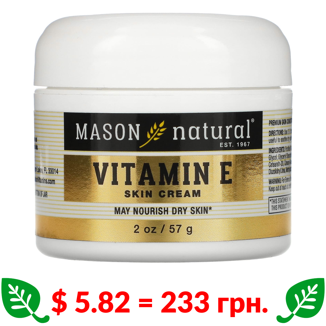 $ 5.82 = 233 грн. Mason Natural, крем для шкіри з вітаміном E, 57 г (2 унції)