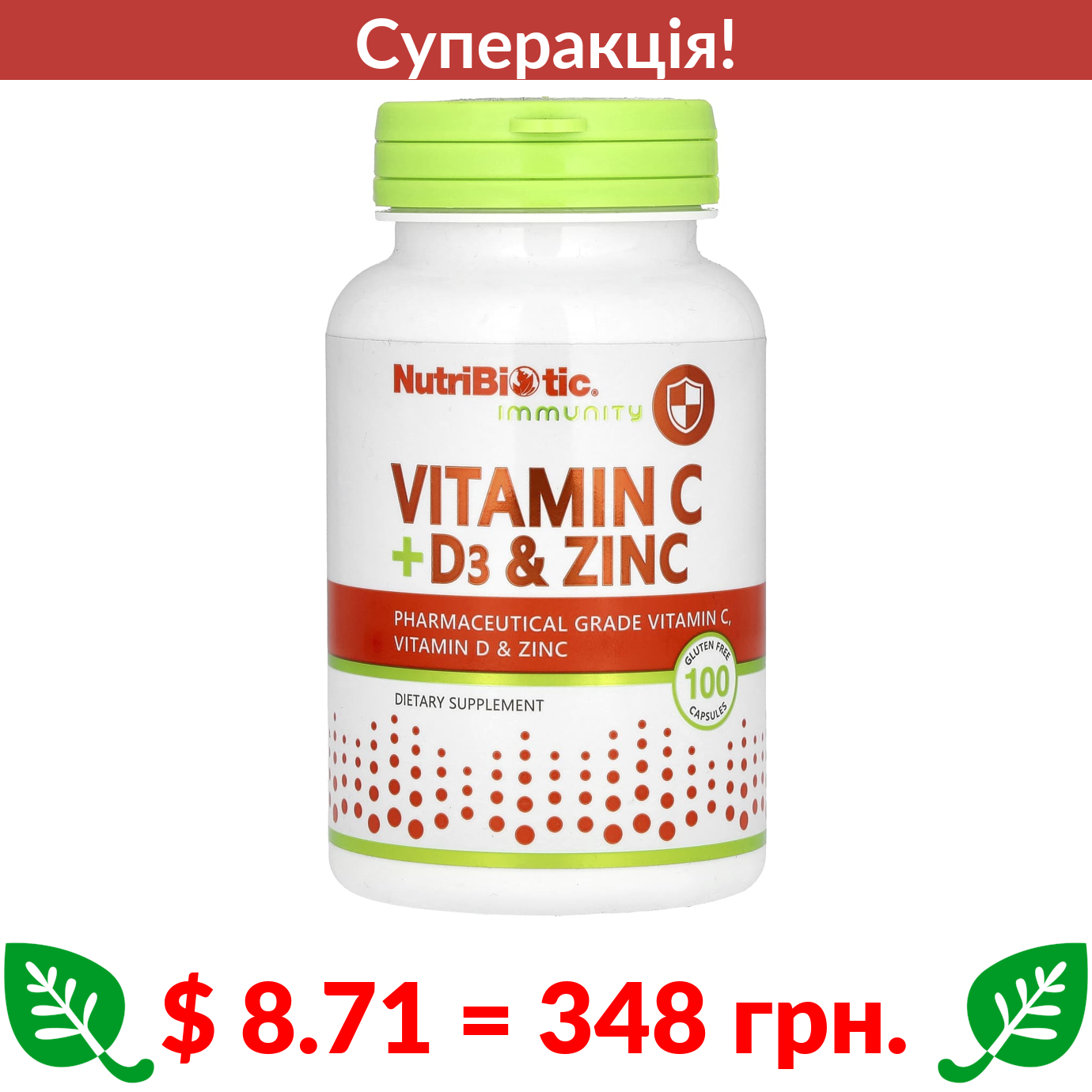 $ 8.71 = 348 грн. ???? cуперакція! ???? NutriBiotic, Immunity, вітаміни C + D3 та цинк, 100 капсул