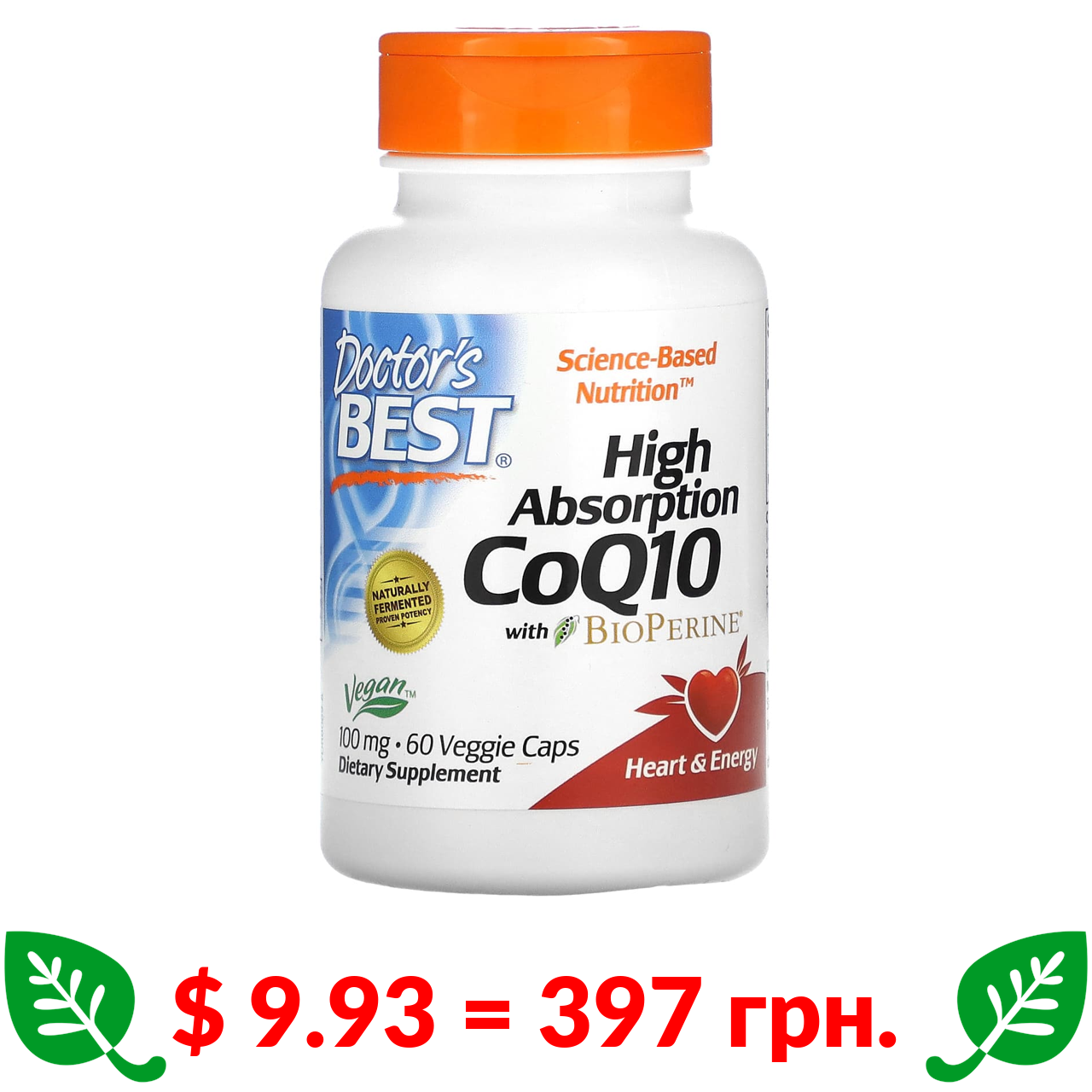 $ 9.93 = 397 грн. ????️ у кошику ????️ Doctor’s Best, коензим Q10 з високим ступенем всмоктування з BioPerine, 100 мг, 60 веганських капсул
