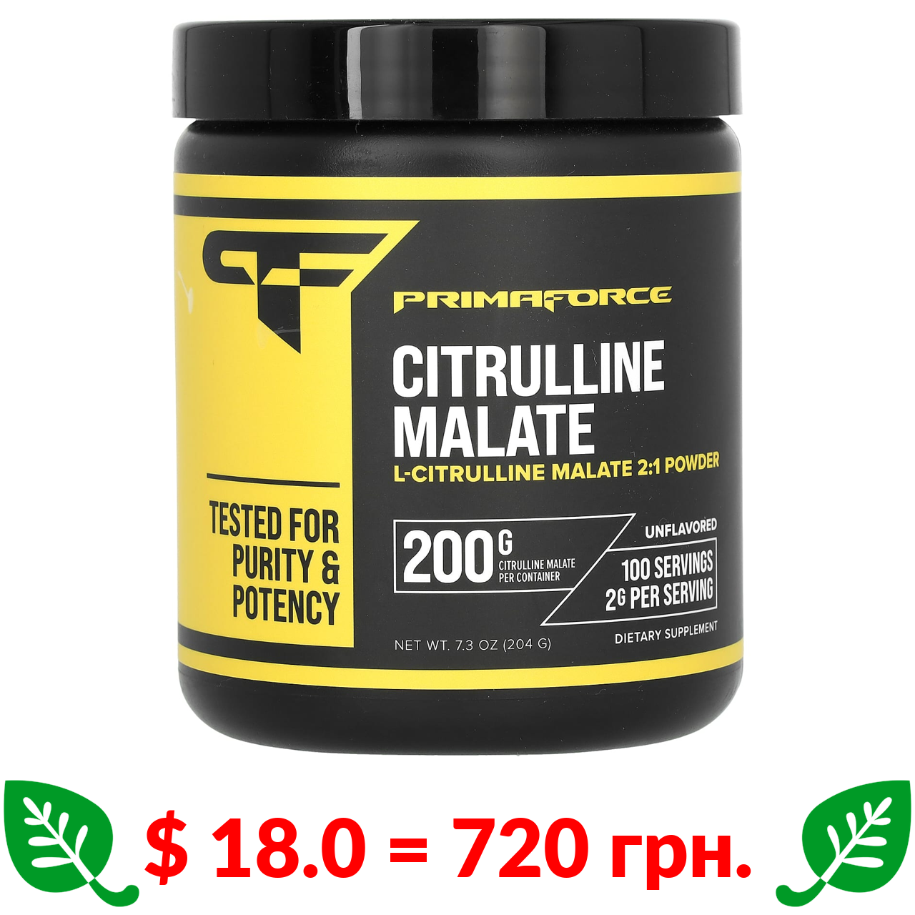$ 18.0 = 720 грн. Primaforce, малат цитруліну, з нейтральним смаком, 204 г (7,3 унції)