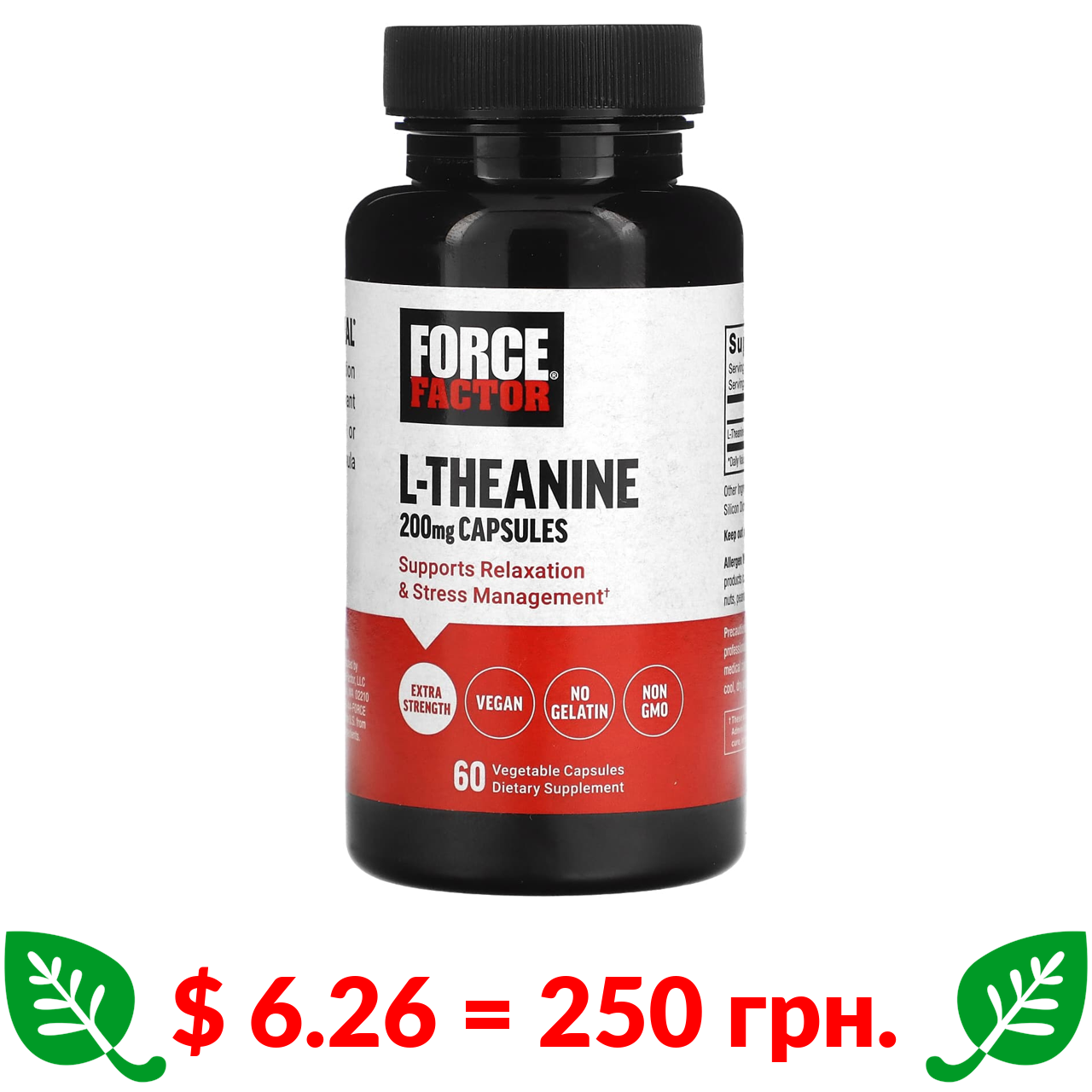 $ 6.26 = 250 грн. ????️ у кошику ????️ Force Factor, L-Theanine, Extra Strength , 200 mg , 60 Vegetarian Capsules