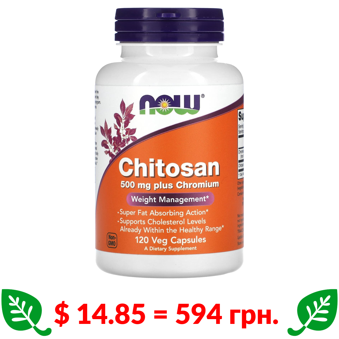 $ 14.85 = 594 грн. Now Foods, хітозан з хромом, 500 мг, 120 вегетаріанських капсул