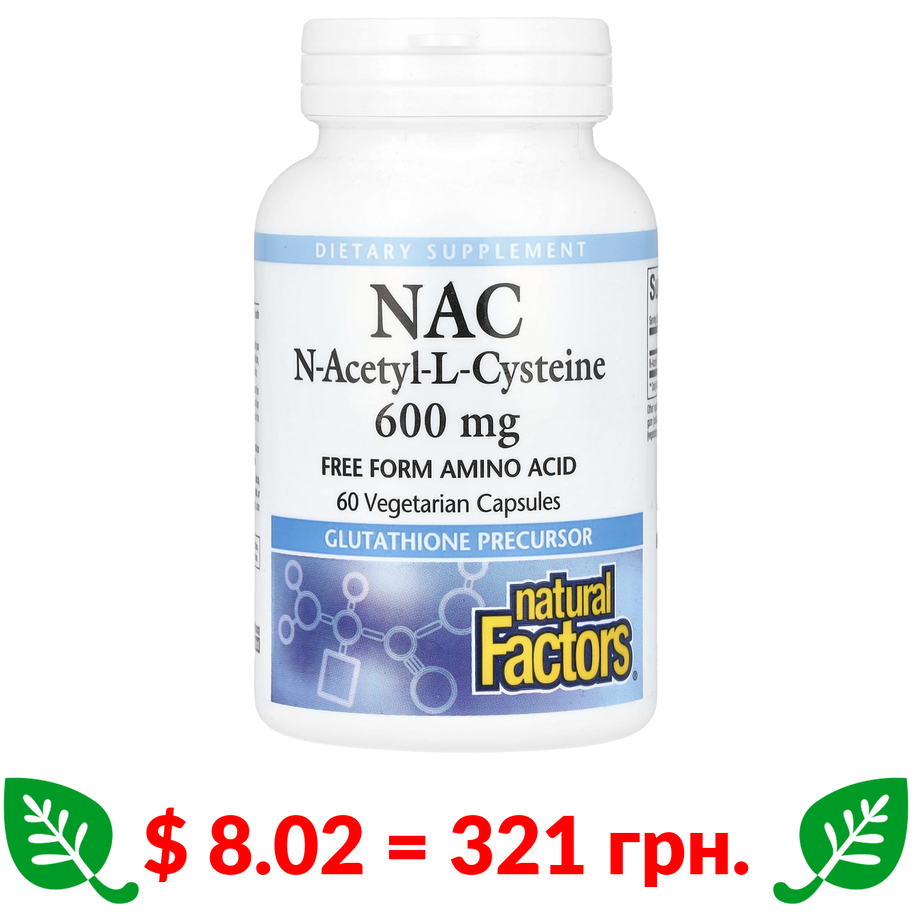 $ 8.02 = 321 грн. ????️ у кошику ????️ Natural Factors, NAC N-ацетил-L цистеїн, 600 мг, 60 вегетаріанських капсул