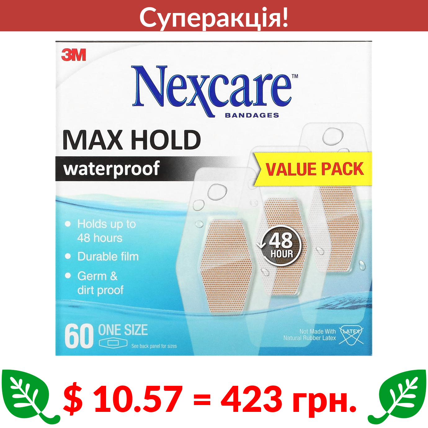$ 10.57 = 423 грн. ???? cуперакція! ???? Nexcare, Waterproof Bandages, Max Hold, 60 One Size Bandages