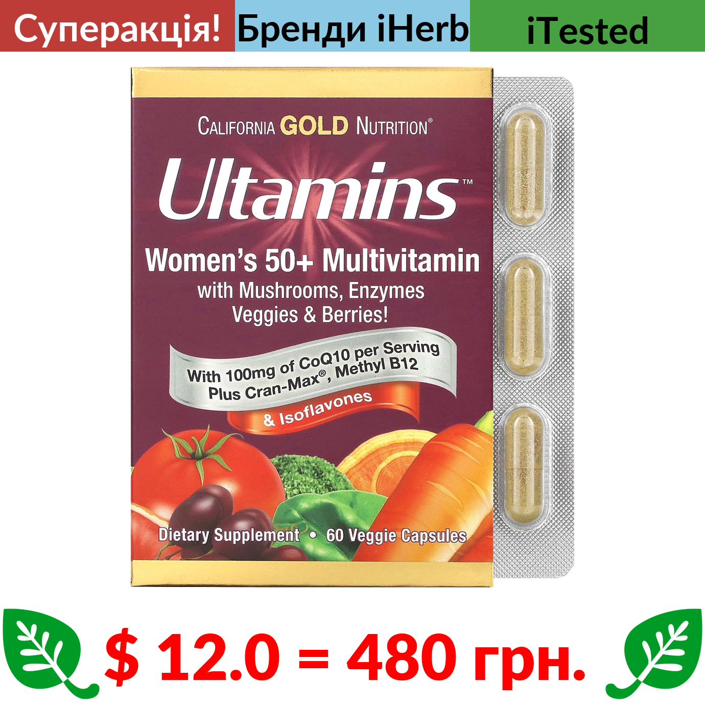$ 12.0 = 480 грн. ???? cуперакція! ???? California Gold Nutrition, Ultamins, мультивітаміни для жінок старше 50 років із коензимом Q10, гриби, ферменти, овочі та ягоди, 60 вегетаріанських капсул