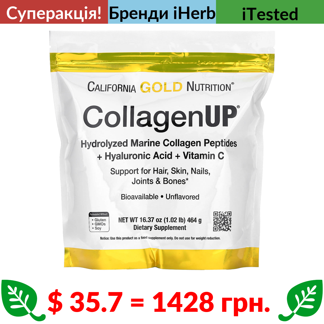$ 35.7 = 1428 грн. ???? cуперакція! ???? California Gold Nutrition, CollagenUP, пептиди гідролізованого морського колагену з гіалуроновою кислотою та вітаміном C, без добавок, 464 г (16,37 фунта)