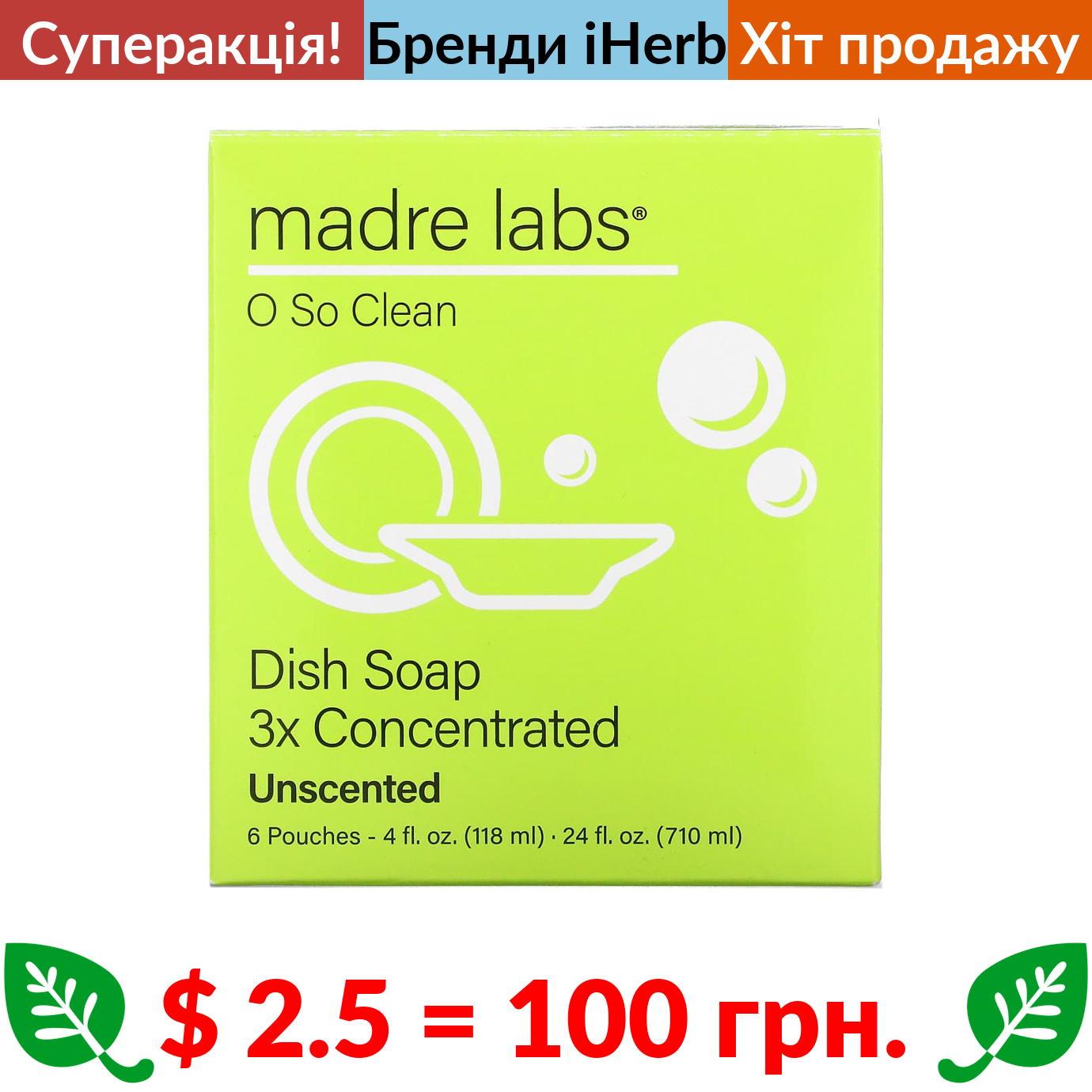 $ 2.5 = 100 грн. ???? cуперакція! ???? Madre Labs, засіб для миття посуду, потрійний концентрат, без запаху, 6 пакетиків, по 118 мл (4 рідк. унції) кожний