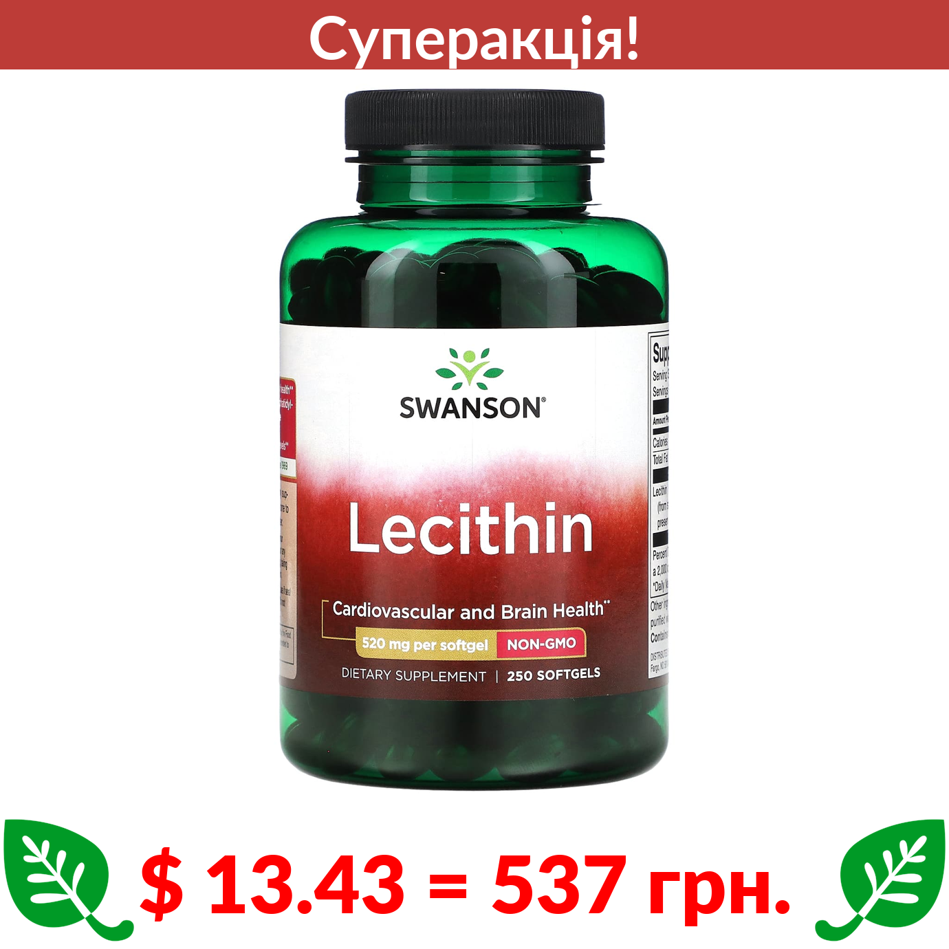 $ 13.43 = 537 грн. ???? cуперакція! ???? Swanson, лецитин, 520 мг, 250 капсул