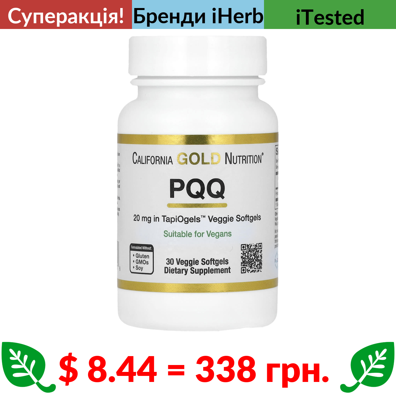$ 8.44 = 338 грн. ???? cуперакція! ???? California Gold Nutrition, піролохінолінхінон, 20 мг, 30 рослинних капсул