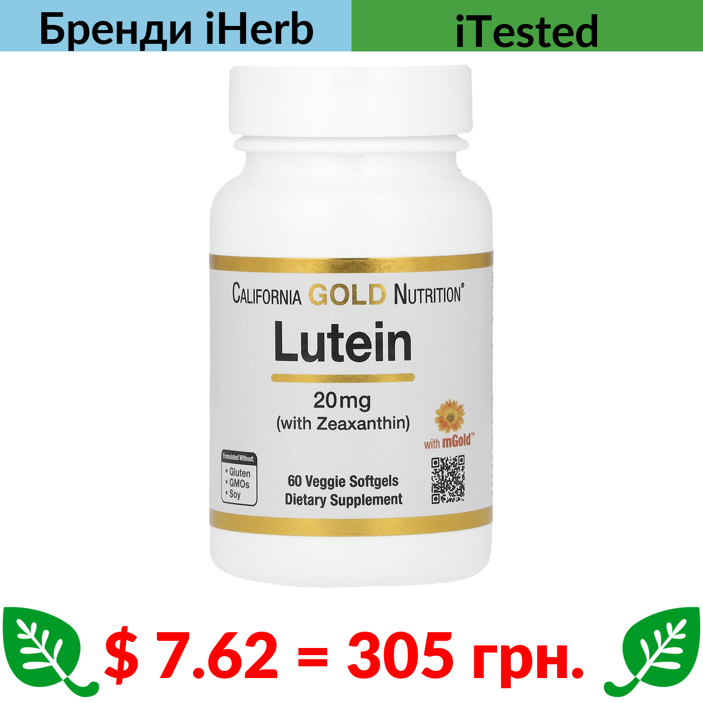 $ 7.62 = 305 грн. ????️ у кошику ????️ California Gold Nutrition, лютеїн із зеаксантином, 20 мг, 60 вегетаріанських капсул