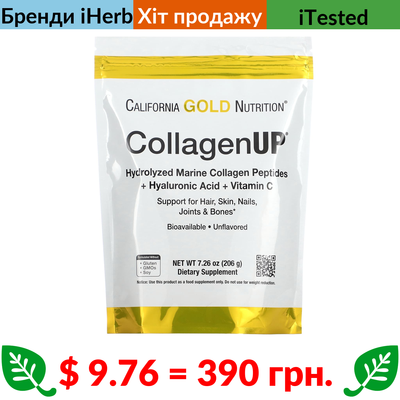 $ 9.76 = 390 грн. ????️ у кошику ????️ California Gold Nutrition, CollagenUP, пептиди гідролізованого морського колагену з гіалуроновою кислотою та вітаміном C, без добавок, 206 г (7,26 фунта)