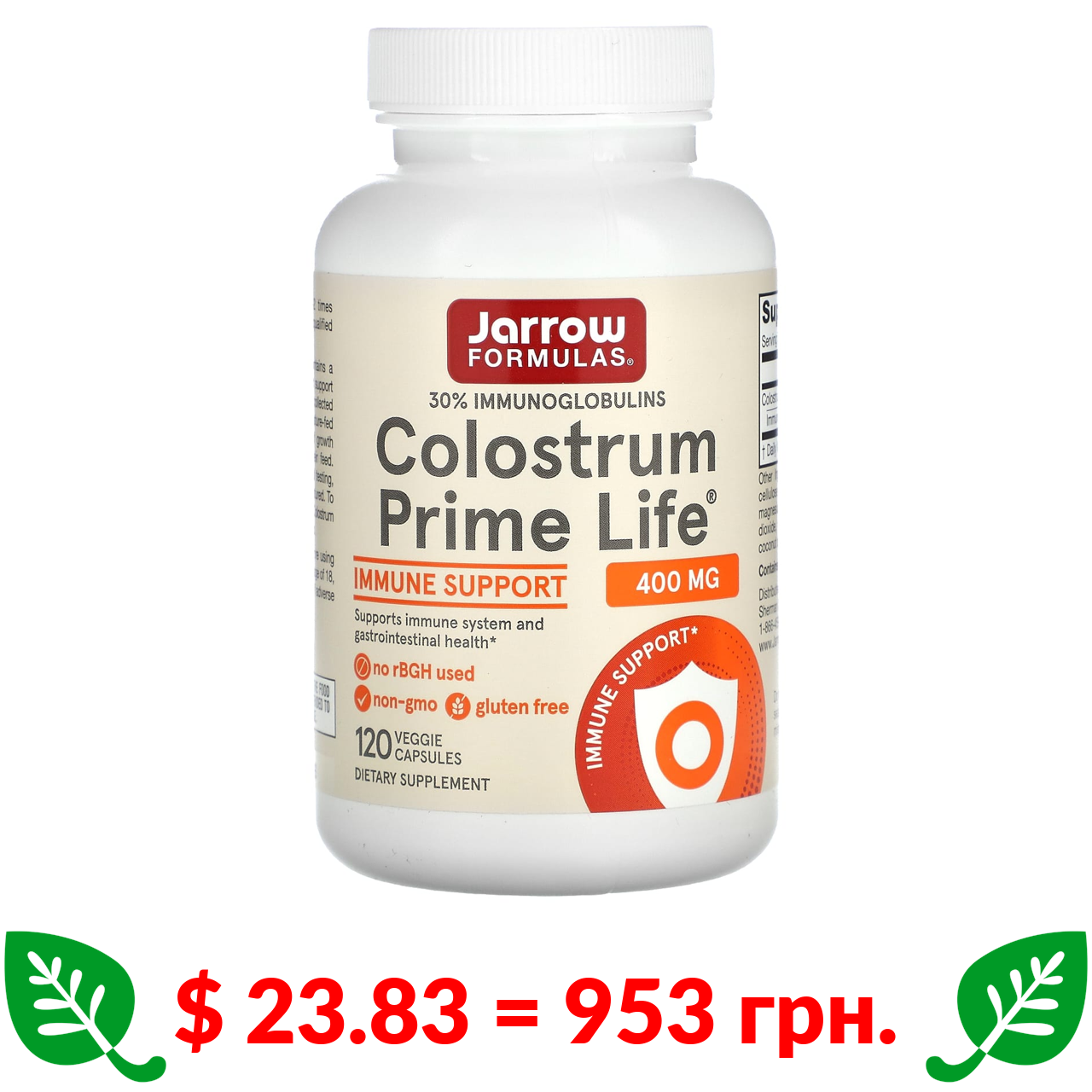 $ 23.83 = 953 грн. Jarrow Formulas, Colostrum Prime Life, молозиво, 400 мг, 120 рослинних капсул