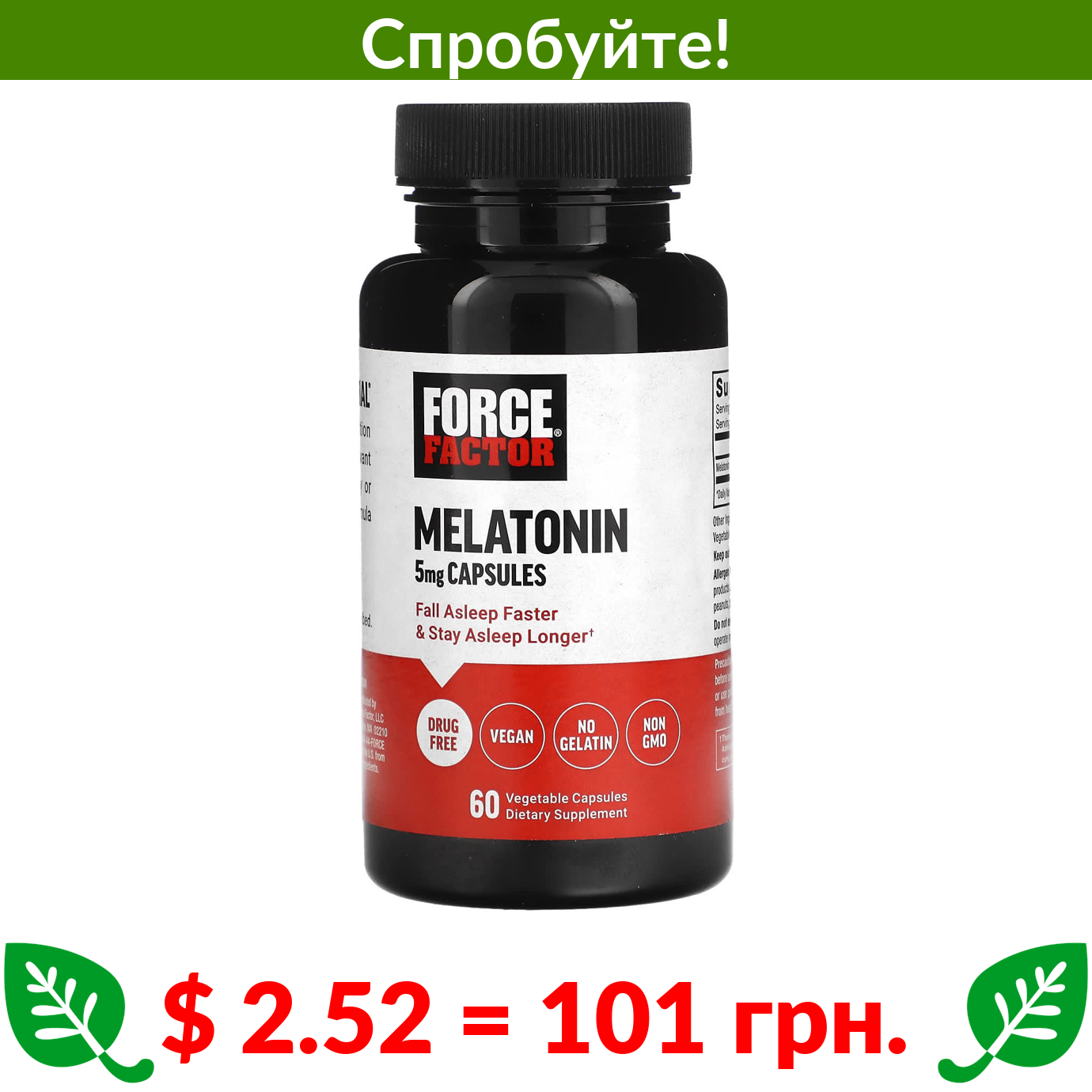 $ 2.52 = 101 грн. ???? варто спробувати ???? Force Factor, Melatonin, 5 mg, 60 Vegetable Capsules
