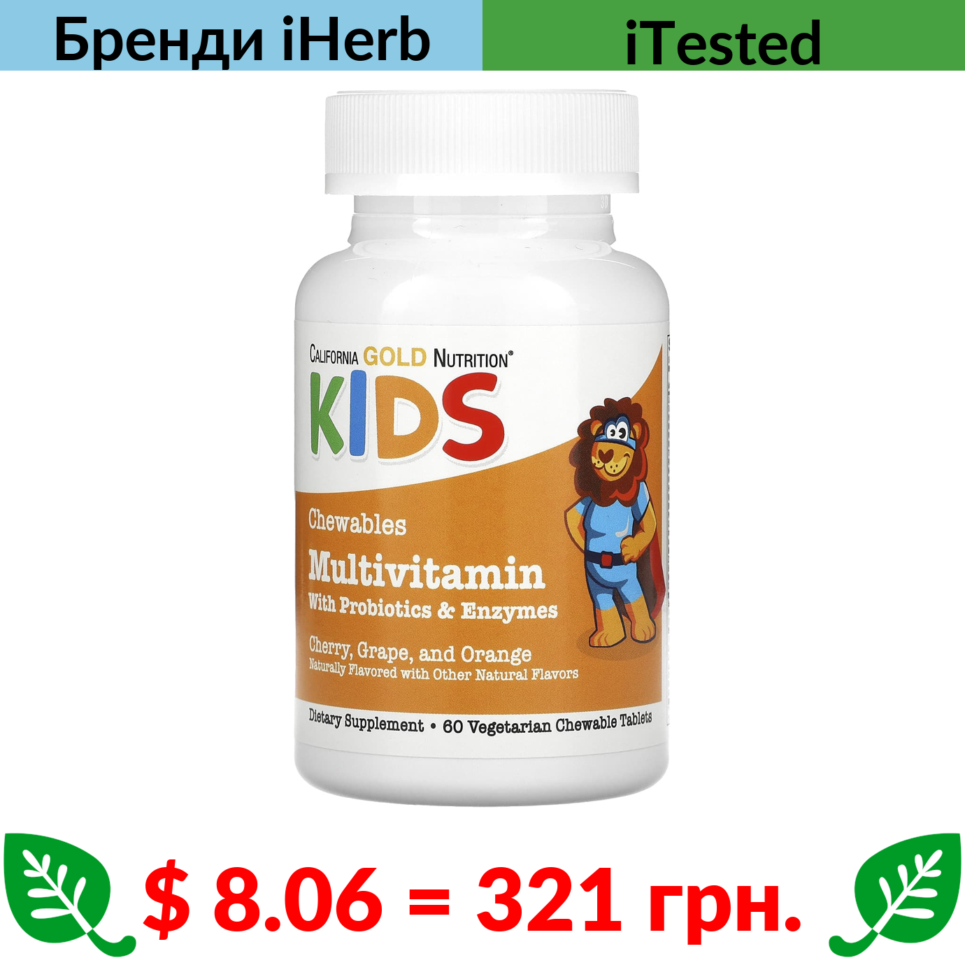 $ 8.06 = 321 грн. ????️ у кошику ????️ California Gold Nutrition, жувальні мультивітаміни з пробіотиками та ферментами для дітей, фруктове асорті, 60 вегетаріанських таблеток