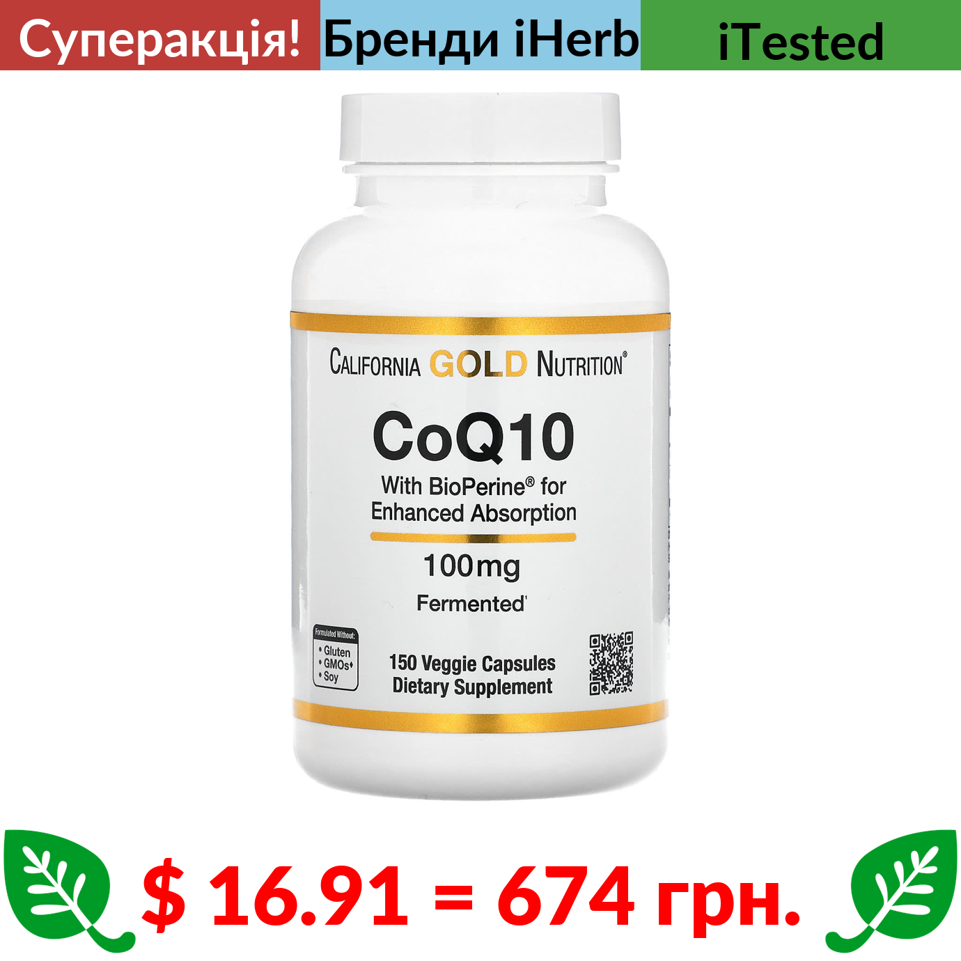 $ 16.91 = 674 грн. ???? cуперакція! ???? California Gold Nutrition, коензим Q10 класу USP із Bioperine, 100 мг, 150 вегетаріанських капсул