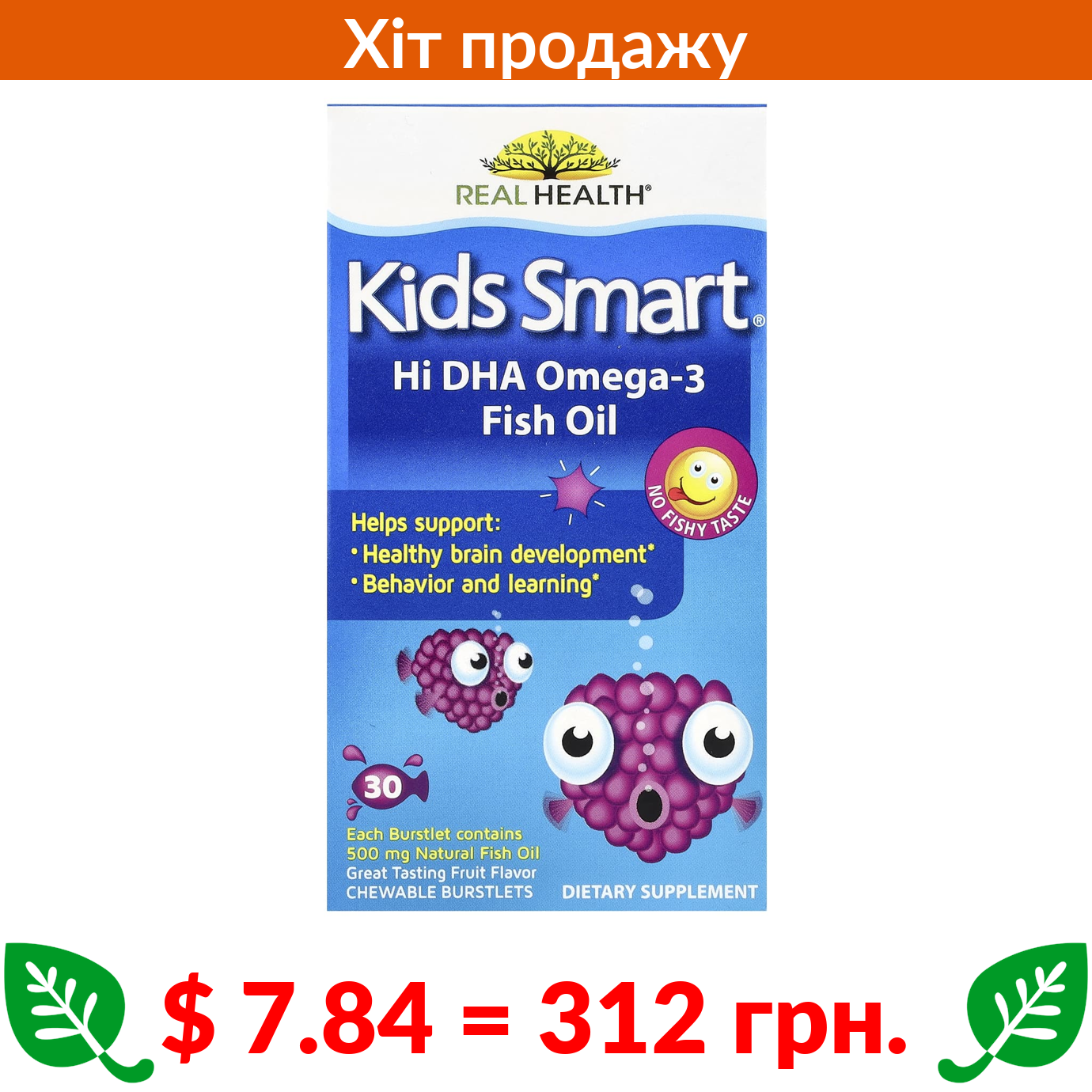 $ 7.84 = 312 грн. ????️ у кошику ????️ Bioglan, Kids Smart, риб’ячий жир із високим вмістом омега-3 ДГК, чудовий фруктовий смак, 30 жувальних капсул