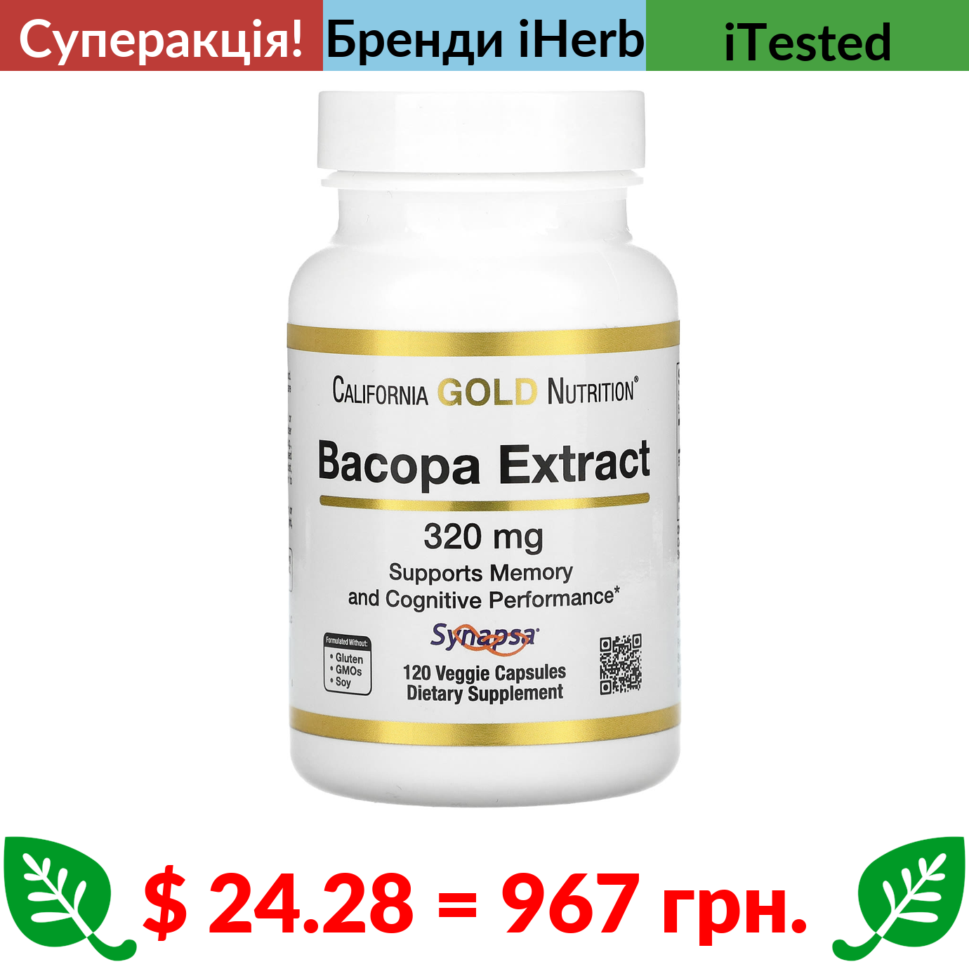 $ 24.28 = 967 грн. ???? cуперакція! ???? California Gold Nutrition, екстракт бакопи, 320 мг, 120 вегетаріанських капсул