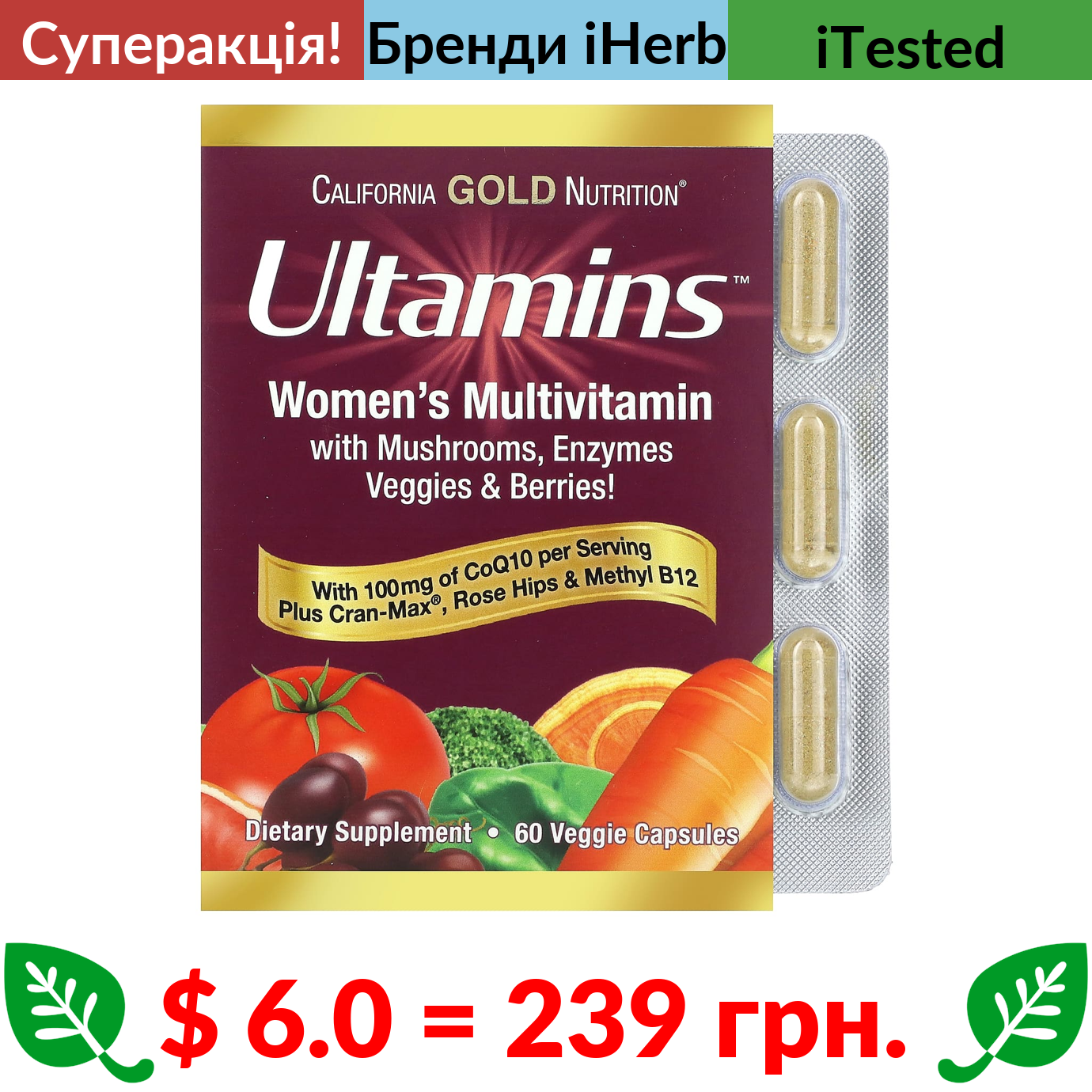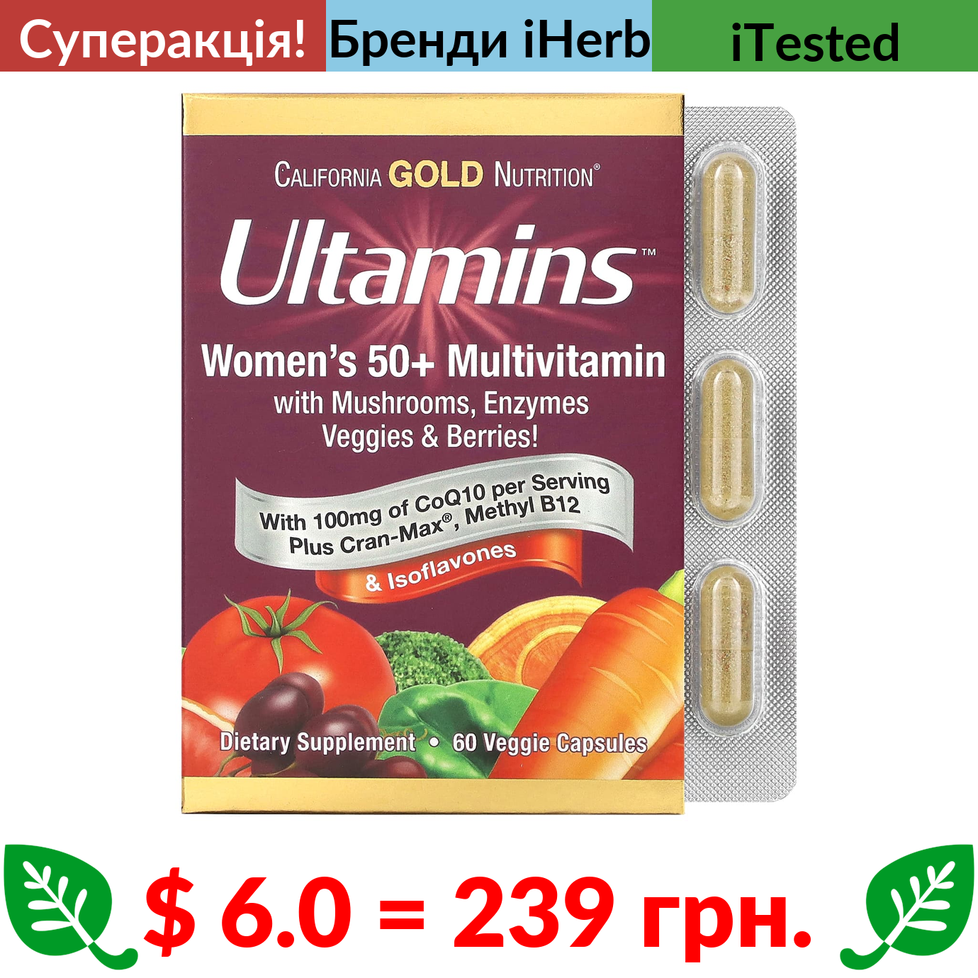 $ 6.0 = 239 грн. ???? cуперакція! ???? California Gold Nutrition, Ultamins, мультивітаміни для жінок старше 50 років із коензимом Q10, гриби, ферменти, овочі та ягоди, 60 вегетаріанських капсул