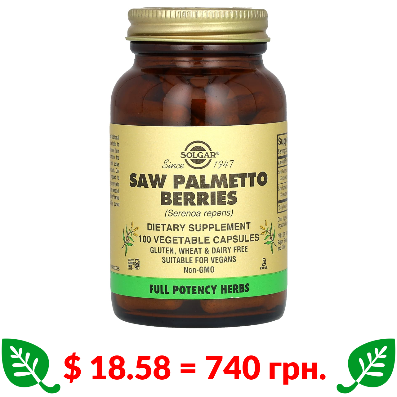 $ 18.58 = 740 грн. Solgar, Saw Palmetto Berries, 100 Vegetable Capsules
