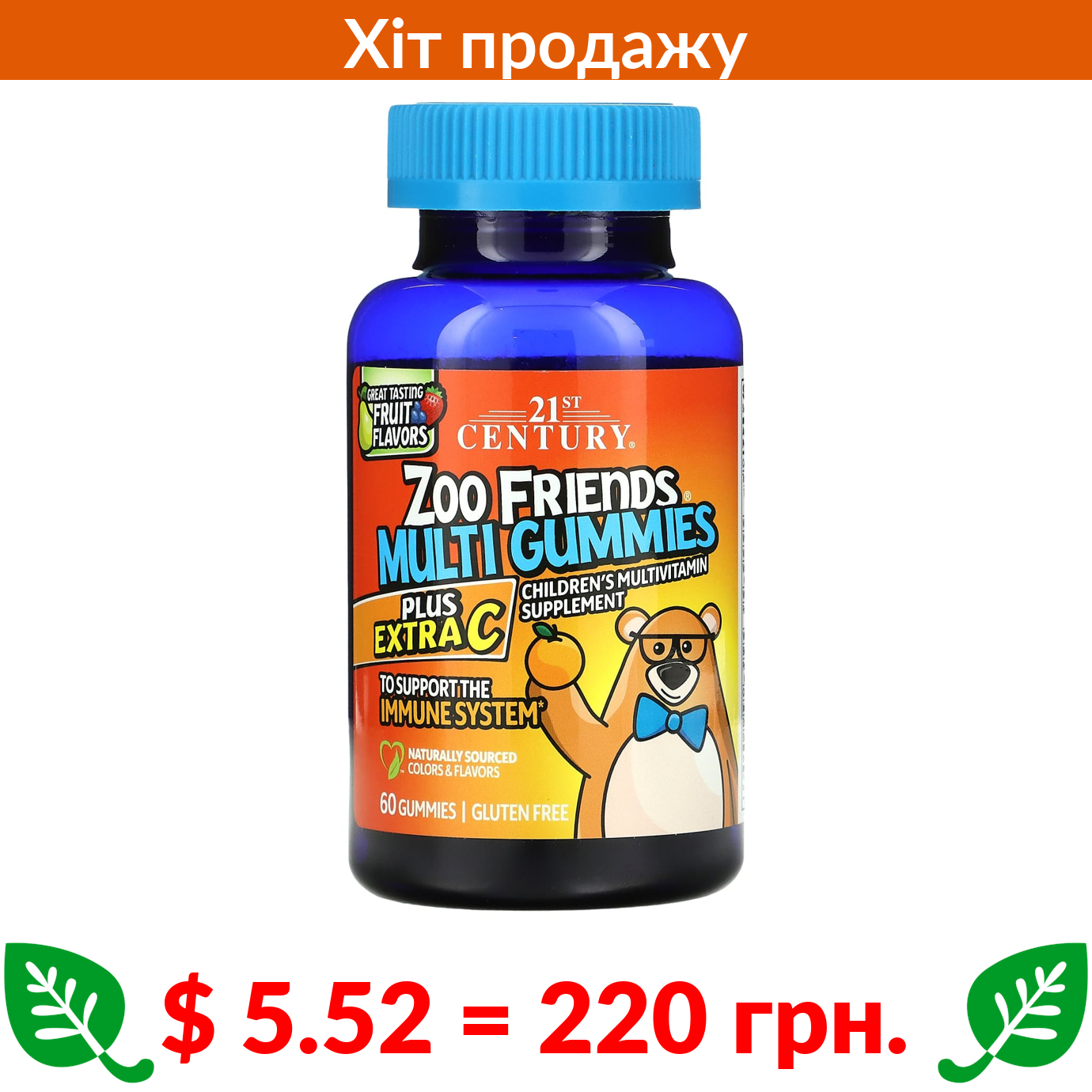 $ 5.52 = 220 грн. ????️ у кошику ????️ 21st Century, Zoo Friends, мультивітаміни в жувальних таблетках, з додатковим вітаміном С, 60 жувальних таблеток