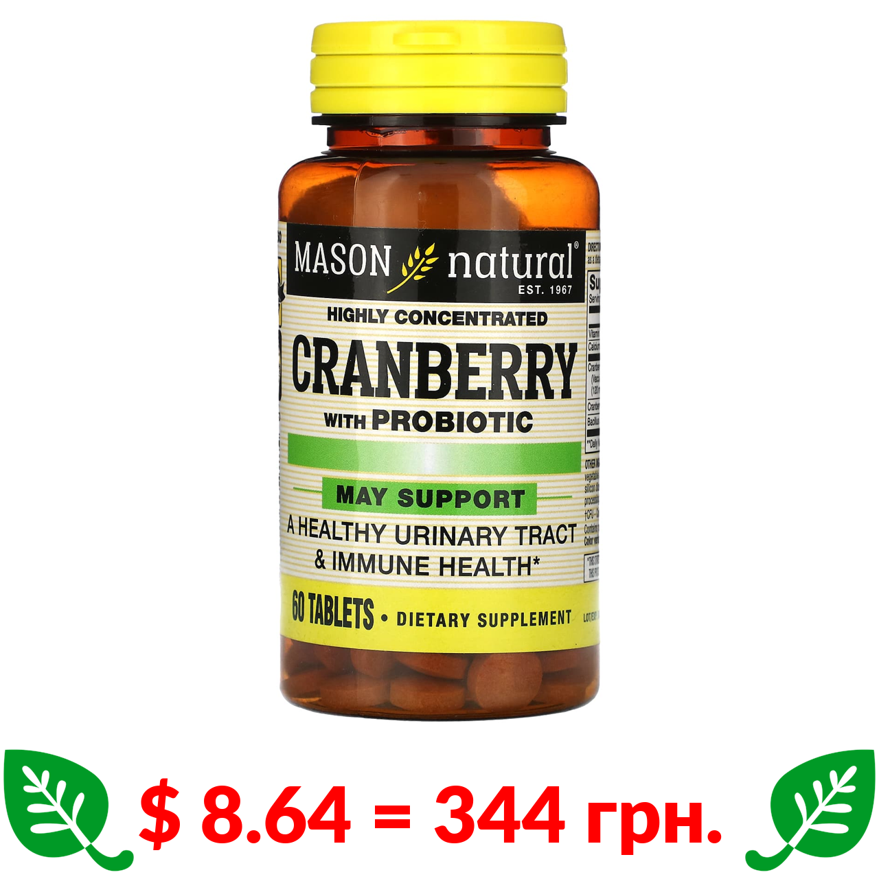 $ 8.64 = 344 грн. ????️ у кошику ????️ Mason Natural, Cranberry with Probiotic, Highly Concentrated, 60 Tablets