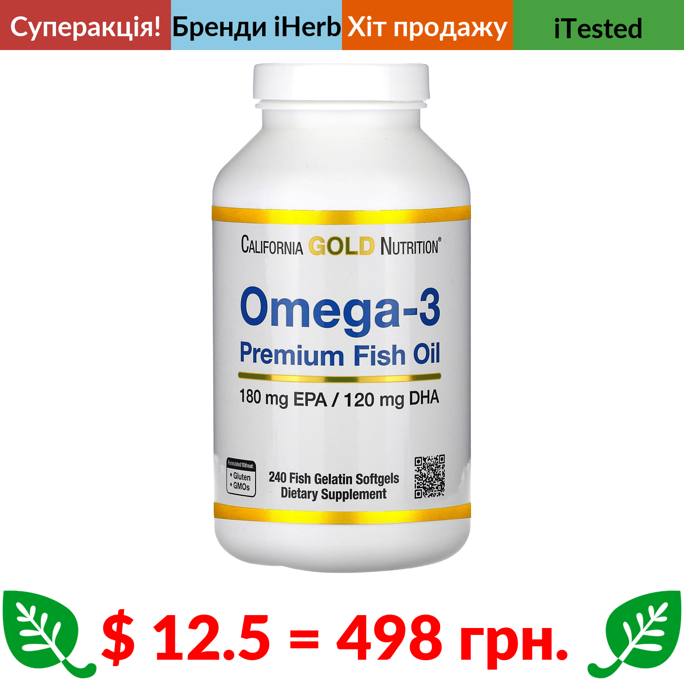 $ 12.5 = 498 грн. ???? cуперакція! ???? California Gold Nutrition, омега-3, риб’ячий жир преміальної якості, 240 риб’ячих желатинових капсул
