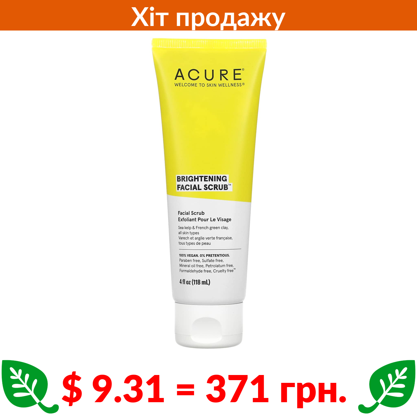 $ 9.31 = 371 грн. ACURE, освітлювальний скраб для обличчя, 118 мл (4 рідк. унції)