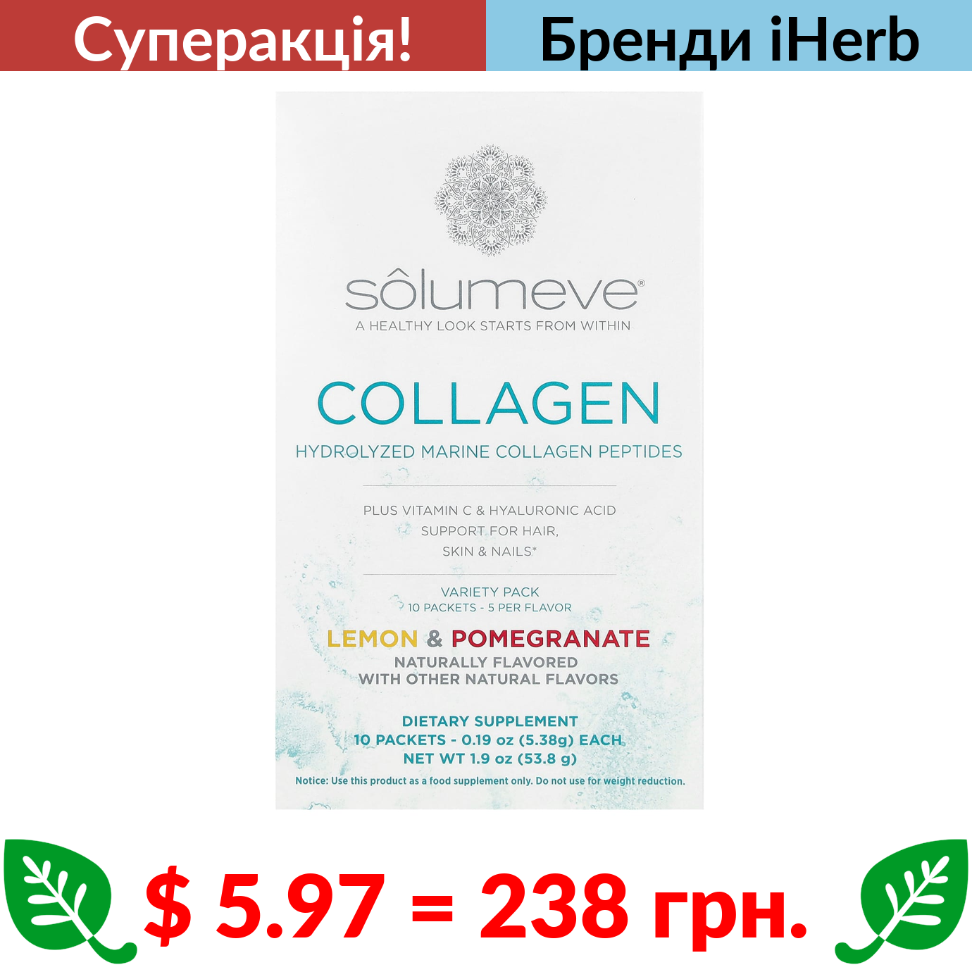 $ 5.97 = 238 грн. ???? cуперакція! ???? Solumeve, пептиди морського колагену, вітамін C та гіалуронова кислота, асорті зі смаком лимона та граната, 10 пакетиків по 5,38 г (0,19 унції)